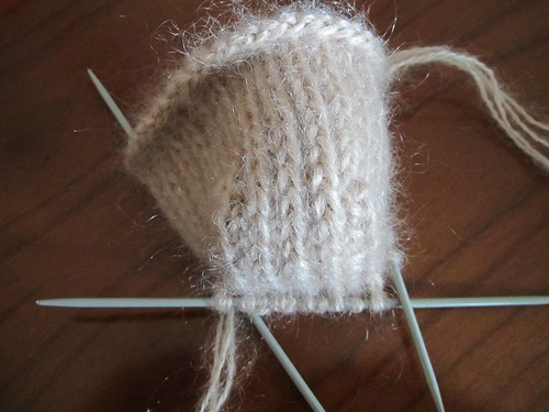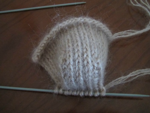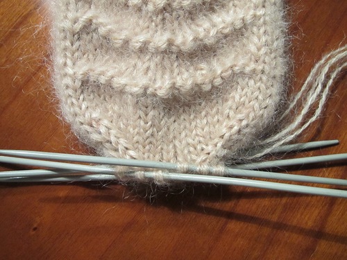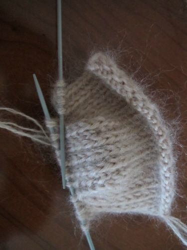 На фотографии колпачок пятки. На левой стороне сокращение петель закончилось. Здесь необходимо набрать на вторую спицу петли из кромочного ряда и провязать их лицевыми петлями, перевернув работу, провязываем эти петли изнаночными, потом петли на колпaчке, совершив последнее сокращение (должны остаться 10 петель колпачка пятки). Набираем из кромочных петель противоположной стороны петли на 3 спицу и провязываем их изнаночными. Вязание продолжается на 4 спицах, одна из них рабочая.