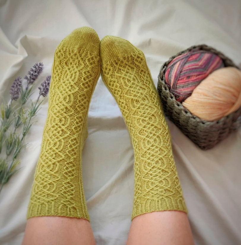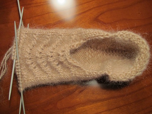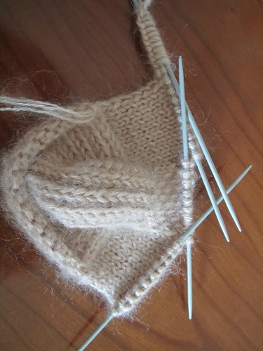 начинаю на 2 спицах (30петель), вывязываю высоту пяточки, потом колпачок пятки (10 петель)...набираю из косичек пятки дополнительные петли и вяжу на 4 спицах до окончания выемки...набираю дополнительные петли и вяжу дальше вкруговую на 5 спицах...выемку обвязываю крючком..