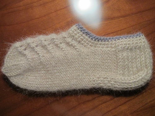 По бокам вязание производится чулочной вязкой (лицевыми петлями на лицевой стороне, изнаночными на изнаночной) Вязание петель на подошве после колпачка опишу на след. фотографии.