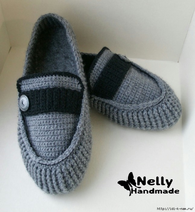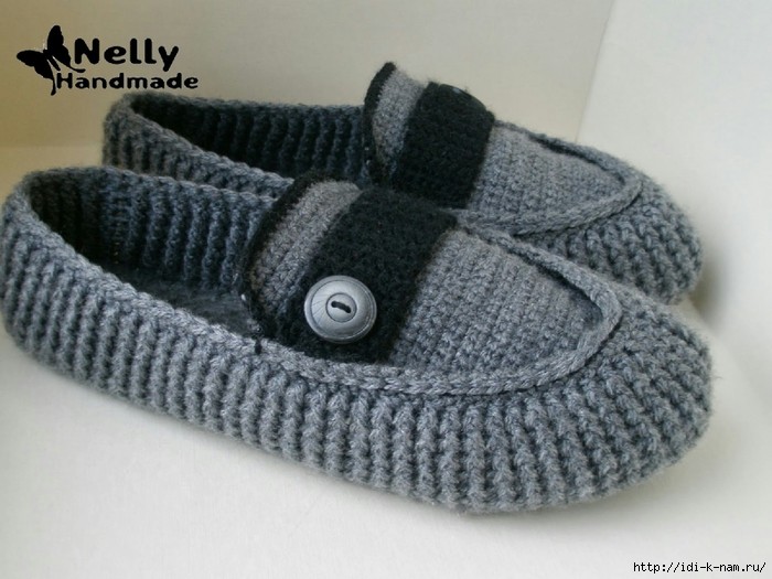 Связала любимому тапочки комнатные. В танчики он у меня не играет, но хотелось какие-то особенные тапочки подарить. Вот и придумались мокасины. Точнее я совершенно случайно наткнулась на эту идею (чужую идею, чего уж там скрывать). Схемы к ним не было, поэтому пришлось сочинять, как всегда.