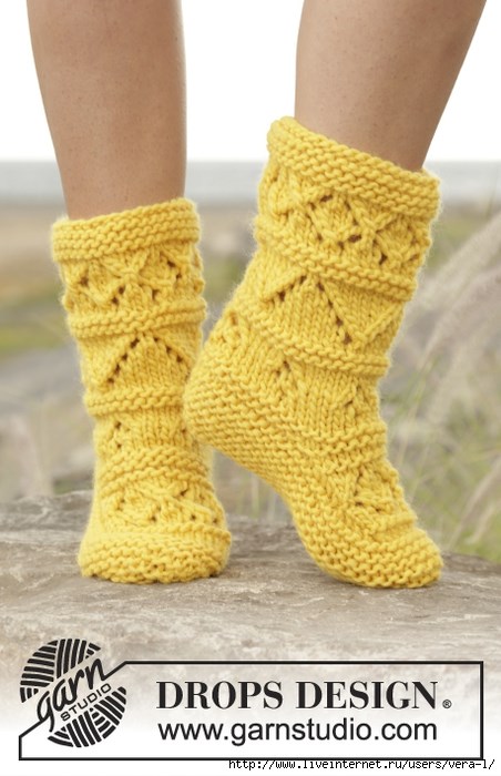 В след. лиц.р. вязать: вернуть отложенные петли с 1-ой доп. спицы и провязать их лиц.п., поднять по краю детали 12-14-16 п. с одной и со второй стороны, провязать центр. петли этой детали и закончить петлями со 2-ой доп. спицы = 63-69-75 п. Теперь высоту детали измерять от этого ряда. Продолжить вязание платочным узором, при этом в центре поставить маркер, через 2 см убавить по 1 п. с каждой стороны от маркера, провязав 2 п. вместе лиц. Повторять ряд убавлений в каждом 2-ом ряду и в это же самое время когда высота детали составит 4-4-5 см убавить по 1 п. с каждой стороны у кром.п. аналогичным образом. Повторять ряд убавлений в каждом 2-ом ряду. Через 5-5-6 см закрыть петли. Сшить задний шов носка и выполнить шов на подошве.