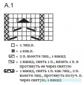 Набрать 68-68-72 п., соединить в круг и вязать 1 круг лиц.п. Продолжить вязание резинкой 2х2 (2 лиц.п., 2 изн.п.) на высоту 4 см. Далее выполнить 1 круг лиц.п. и в это же самое время равномерно убавить 2-2-6 п., продолжить вязание по схеме узора А.1 (повторить раппорт 6 раз).