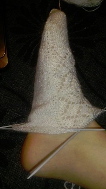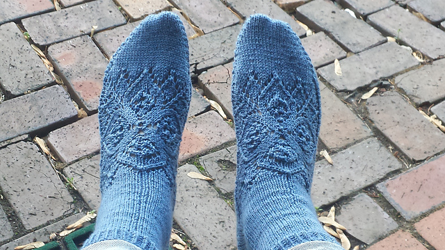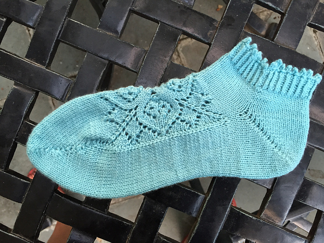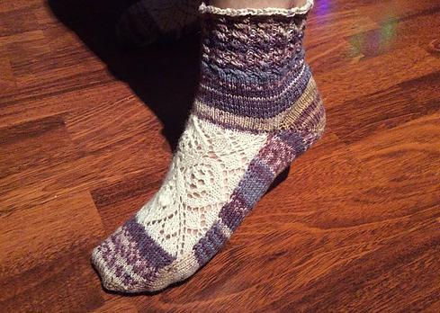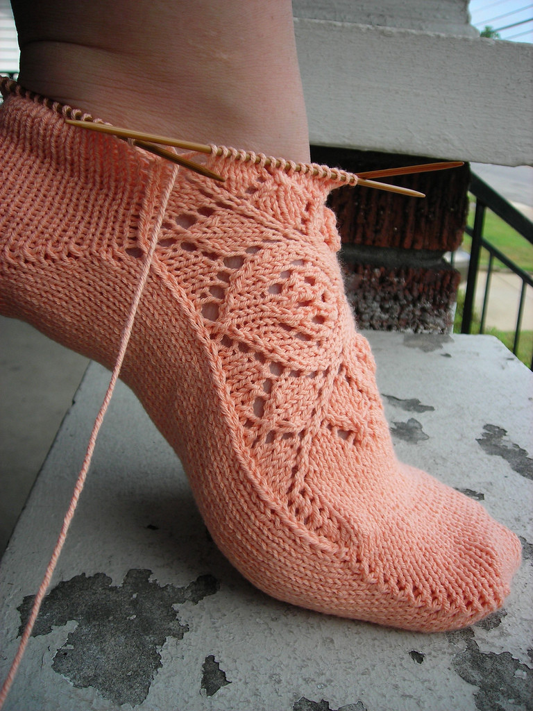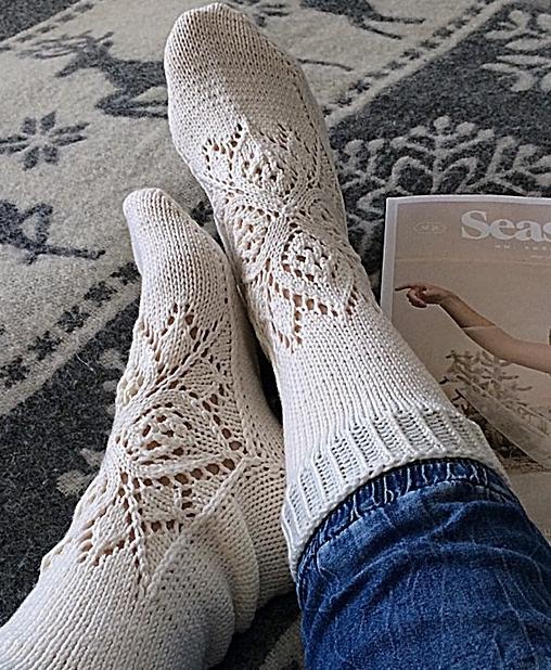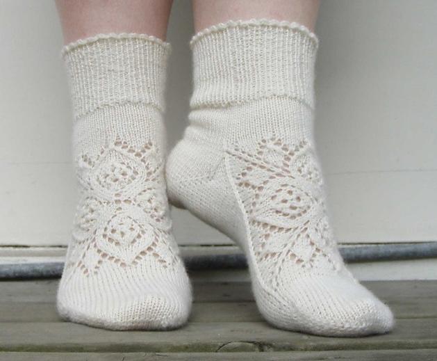Эти носки вяжутся чулочными спицами, начиная с квадратного мотива верха стопы, затем вяжется сторона пальцев, затем - подошва, пятка и манжет.