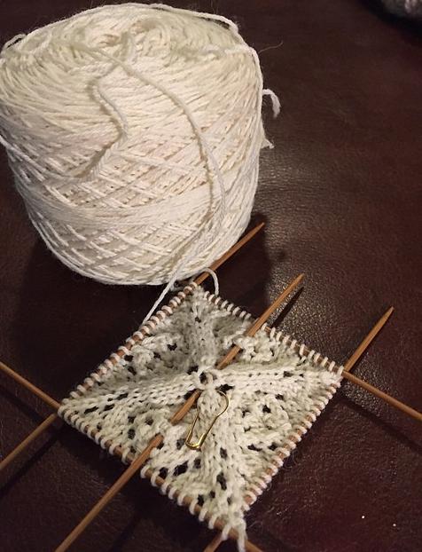 Продолжать провязывать по 2 вместе лиц. с лиц. стороны и 2 вместе изн. с изн. стороны с петлями с 2-й и 4-й спиц., пока все петли 2-й и 4-й спиц не будут провязаны.
