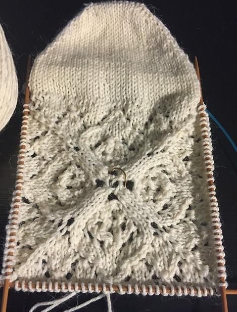 Далее продолжать вязать лицевой гладью, одновременно снимать на дополнительные спицы по 1 рабочей петли в начале каждого ряда, пока на рабочих спицах не останется 8 петель.