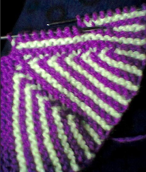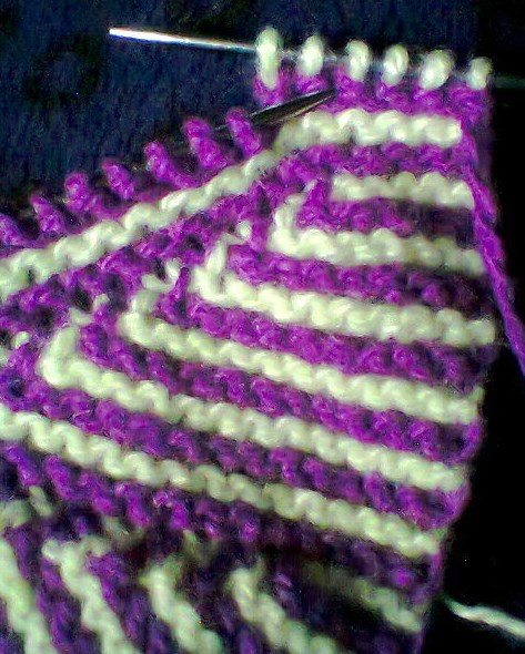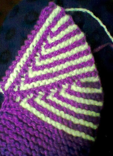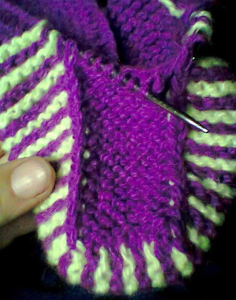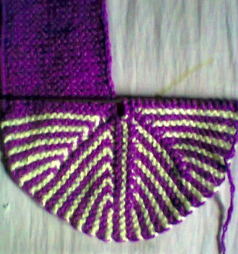Когда связана верхняя часть тапочка, набираю по краю петли на три спицы. У меня где-то 120 петель.Провязываю 4ряда лицевыми. Затем делю петли на три части. 55-10-55 И вяжу средние 10 петель как пяточку у носка.