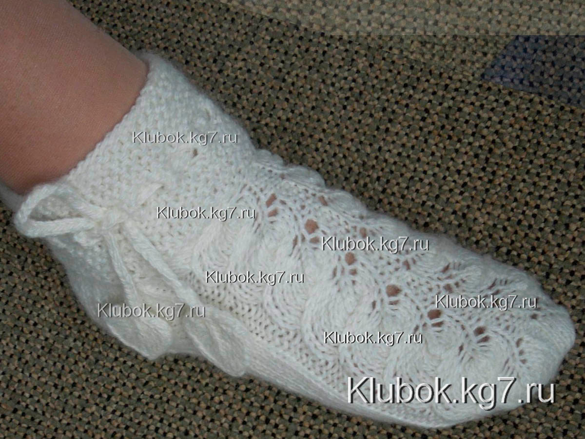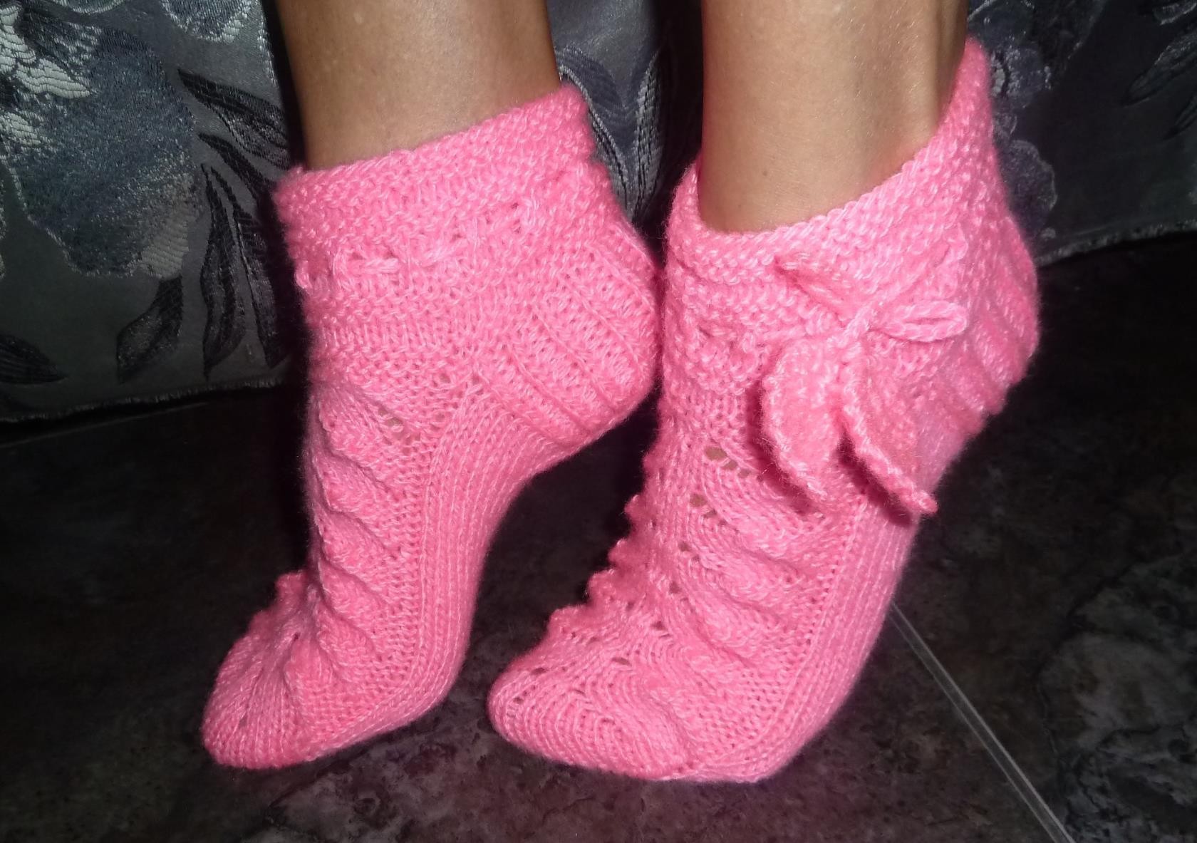 Далее вяжем на 2-х спицах (24 петли) лицевые петли, а на двух (24 петли) — узор (это верх тапочка).