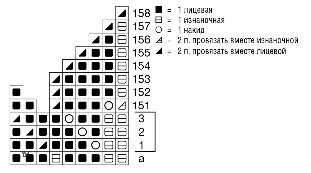 Через 32,5 см = 150 круг.р. от планки или по достижении желаемой длины начать выполнять убав- ки для мыска. Для этого 1 раз провязать 151–158-й круг.р.
