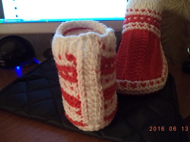 Набрать 55 петель. оц - основной цвет нити, д ц - дополнительный цвет нити, сн - снять, зр - нить за работой, пр - нить перед работой оц. 1-4ряд резинка 1/1 оц. 2 ряда лицевыми д ц. 1-2ряд - лицевые оц. 3ряд - кр, 1сн (зр), 1лиц оц. 4ряд - кр, 1сн (пр), 1лиц д ц. 5-6ряд - лицевые оц. 7-8ряд - лицевые д ц. 9ряд - кр, 1сн (зр), 1лиц д ц. 10ряд - кр, 1сн (пр), 1лиц оц. 11-12ряд - лицевые д ц. 13-14ряд - лицевые д ц. 15ряд - провязать 20 петель на другую спицу ( можно кольцевые или на булавку), средние 15 петель вяжем платочной вязкой ( 30 рядов) и вторые 20 тоже на дополнит.спицу снять 31ряд - кр, 2 вм лиц, 9лиц, 2 вм лиц, кр 32ряд - лицевые 33ряд - кр, 2 вм лиц, 7лиц, 2 вм лиц, кр 34ряд - лицевые. ( 11 п) продолжаем вязать - 20 с доп.спицы ,набираем сбоку петли ( 17 ), провязать средние 11 петель, набрать с другого бока 17 петель, довязать оставшиеся петли (20) д ц. 16ряд - 85 лиц оц. 17-18ряд -лицевые д ц. 19-20 ряд - лицевые оц. 21ряд - кр, 1 сн (зр), 1лиц оц. 22ряд - кр, 1 сн (пр), 1лиц д ц. 23-24 ряд - лицевые дополнительную нить отрезать оц. 25-26 ряд - лицевые. Всего 85 петель. Подошва начинаем вязать на средних 7 петлях и постепенно добавлять по 1 петле до 13 петель. дальше вяжем как пяточку носочка не довязав по бокам по 5 петель вяжем так - в конце 1 п сбоку и 2 п с середины вместе осталась одна петля и ею сшиваем высоту задника. это на 37-38 размер.?