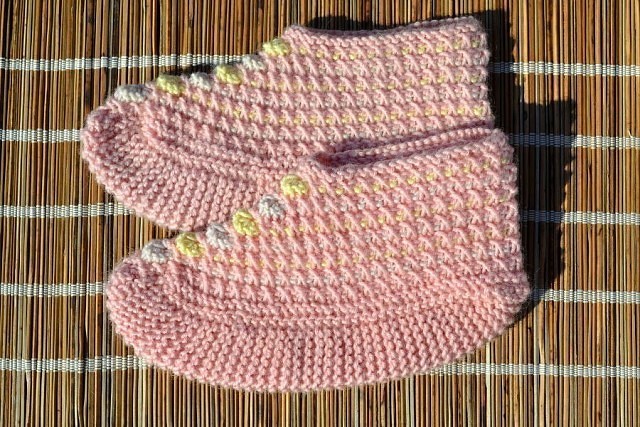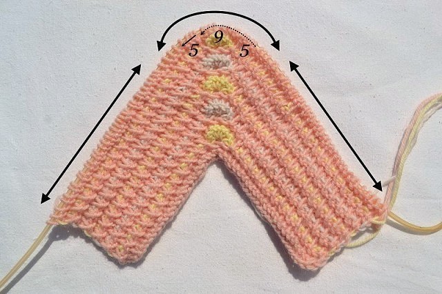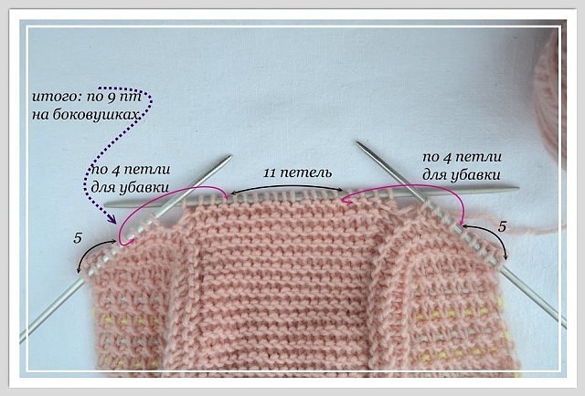 2. Провязать 3-5 рядов платочной вязкой (в лиц. и изн. рядах все петли - лицевые) 3. (можно сразу 2 тапка вязать) Это было вступление, вход для ноги, обхват щиколотки, переходим к следку. 1 ряд (вводим желтую нить) : кромочная, 1 петлю снять как лицевую, следующую провязать лицевой, 4-ую снять как лицевую, следующую 5-ую провязать. Когда снимаем петлю - нить за работой. Вяжем до 25-ой петли, средней. Из нее вывязываем 9 петель: лицевая, накид, лицевая... 26-ую снимаем, 27 - провязываем и так до конца. 2 ряд: Розовые петли снимаем, не провязывая, нить перед работой. Желтые вяжем лицевыми, в том числе и все 9 петель по центру. 3-4 ряд : снова в работе розовая нить, вяжем все лицевыми петлями. Следующий этап - повторите еще четыре раза первые 4 ряда. Опять снимаем лицевые и провязываем через одну, а из центральной, но уже не 25-ой, а 29-ой вывязываем 9 петель. Изнаночный ряд: снимаем и провязываем через одну. И 2 ряда "розовым", основным цветом - все лицевые. Чтобы каждый раз не отсчитывать центральную петлю, делаем так: когда приближаемся к веерочку предыдущего ряда, внимательно смотрим какая петля у него средняя, и из нее вывязываем . Вот тут на фото специально ее сняла со спицы. Как расчитать размер . На примере носков для мужа: 7 раппортов в высоту, 7 вееров = 25 см (ориентировочно, измеряла в уже готовом состоянии) - 40-42 размер. Оказались впритык, но после стирки и носки они чуть-чуть растянутся и будет прекрасно. 6 раппортов, на 1 веерок меньше = 23 см, мой 39-40 размер. В высоту получилось около 7,5-8 см. В розовых следках я связала 6 раппортов, измерила, 20 см. Ниточки тоньше, вяжу туже. Поэтому я буду вязать в розовых 7 вееров. Как перейти к подошве и ее посчитать: Посмотрите на свой следик и прикиньте, сколько петель вы хотите отложить для подошвы. В мужниных у меня 9 см, в розовеньких - 8. Это получилось 19 (17 у мужа) петель. И даже если у вас прикинулось четное количество, уберите 1 петлю, пожалуйста, подошва должна быть нечетная . А число петель на боковинках, соответственно, четное. По центру стрелочками - будет подошва. По бокам - боковинки. И что мы тут можем сделать. Оборвать нить, найти начальную петлю подошвы, присоединиться и вязать, но следки ленивые и я так не делаю. Я провязываю начало лицевого ряда, петли первой боковушки. Провязываю петли подошвы и... переворачиваю вязание. Дальше вязать мы будем только 19 петель , в каждом ряду, и лицевом и изнаночном, провязывая последнюю петлю подошвы, 19-ую и первую петлю боковушки вместе. Перевернули: 18 петель, кромочная и петля боковушки - две вместе. Это принцип. С каждым рядом одна из наших боковушек уменьшается на 1 петлю. Как легко отсчитать середину подошвы, посмотрите, еще раз на рисунок. Я, не считая, вяжу до конца веерка, внимательно смотря, где заканчиваются эти 9 петель, затем: раз, два, три, четыре... 5+6 две вместе, повернули. Вяжу 18 петель, 19+20 две вместе. Повернули. Как я делаю пятку: Люблю плавные линии и округлости, поэтому пяточка у меня вот такая. Раскладываю перед собой вязалку и смотрю, сколько петель я хочу оставить непосредственно для пятки. Из 19 петель отобрала 11. И начинаю перебирать пальцами петли, как "счеты щелкаю". Эти завершающие 11 петель останутся в последнем ряду открытыми и соединятся с открытыми петлями боковушек. Значит 5 петель с одной стороны, и 5 с другой (можно по 6 оставить, т.е. или на 1 петлю больше, или меньше). Смотрю дальше. Значит мн