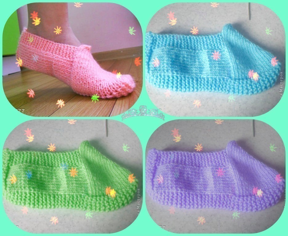 ТАПОЧКИ СПИЦАМИ. Набираем на спицы 5 петель. 1р.(лицевая сторона): кромочная, лиц. накид, лиц. накид. лиц. кромочная изнаночной петлей. 2р.(изнаночная сторона): все петли изнаночными, петля между двумя накидами не провязывается, ее просто снимаем на правую спицу(нить перед работой). 3р.: кромочная, 2 лиц. накид, центральная лицевая, накид, 2 лиц, кромочная. 4 и все четные ряды изнаночными, центральную петлю снимаем не провязывая. 5р.: кромочная, 3 лиц, накид, центр.лиц, накид, 3 лиц, кромочная. Вязать так до тех пор, пока на спицах не наберется 41 петля.(это вместе с центральной и кромочными). Накиды делаются в разные стороны. перед центральной петлей накид "нить перед спицей" (может я не так объясняю, но для меня это наиболее понятный способ объяснения)) После центральной петли накид "Нить за спицей". Количество петель увеличивается... можно перейти на 2 спицы. Вот и две спицы. Набрали 41 петлю.. Формируем основание, подошву следка. Вяжем 15 петель (вместе с кромочной). Далее можно перейти на новую спицу. Вяжем 10 петель,. а 11 и 12 провязываем вместе (за заднюю стенку). Переворачиваем работу. Основание вяжем платочной вязкой (все ряды лицевыми петлями) Провязываем 10 петель, а 11 и 12 вяжем вместе (за переднюю стенку). Т.е формируем носок, по способу формирования пятки у обычного носка. Переворачиваем работу. Снова провязываем 10 петель и 11 и 12 вместе. Снова переворачиваем. Так на спице должно остаться 11 петель. Вот что у нас уже получилось. На пустую спицу набираем 15 петель. Это у нас изнаночная сторона. Поэтому..Провязываем 9 петель изнаночными.И пять лицевыми. Затем кромочная петля изнаночной. Переворачиваем. Все петли на этой спице (15 петель) провязываем лицевыми. Это лицевая сторона. Провязываем средние 11 петель лицевыми. На третью спицу набираем 15 петель. Все 14 петель провязываем лицевыми и 1 кромочная. Это 11 петель основания. основание здесь так же продолжаем вязать платочной вязкой. Вот что получается на изнаночной стороне. 5 петель платочной вязкой, 9 обычной. Вот что получается с лицевой стороны. Уже можно примерить. Далее вяжем по длине стопы. Огромный плюс в этих следках, то что их можно вязать почти на любой размер. Довязав до конца стопы, так же закрываем пятку как закрывали носок. Когда по бокам останется 7-8 петель, по середине платочной вязки основания 2 петли провязываем вместе. Это чтобы следок не спадал с пятки, немного уменьшаем основание. Еще раз можно уменьшить на одну петлю через 3-4 ряда. Закрыв боковые петли, закрываем полностью следок. Вот что получилось. Если следок немного спадает, то по краю можно провязать так же спицами резинку 1х1 или просто крючком столбиками без накида.