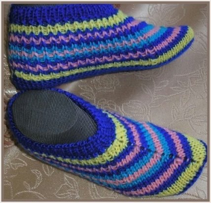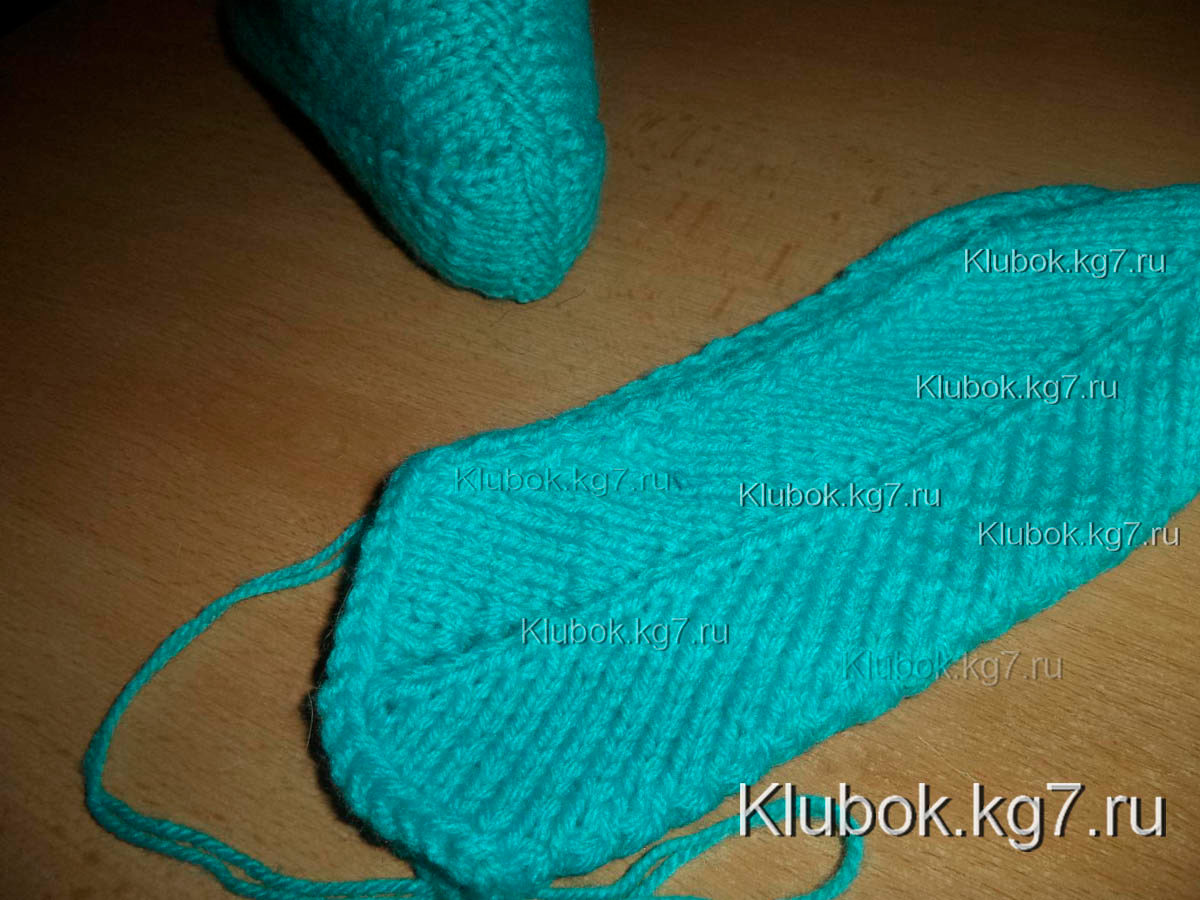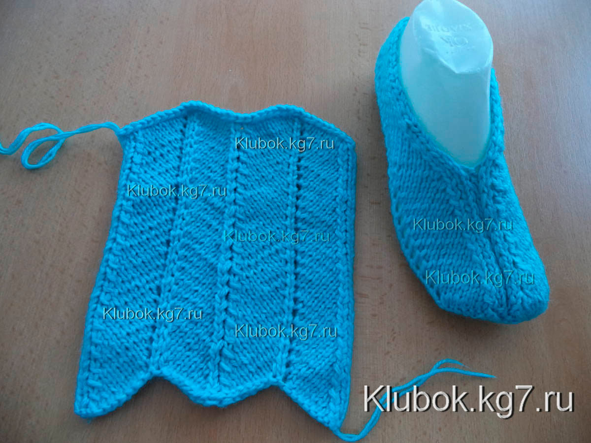 Чередуем полоски из лицевых и изнаночных петель,каждая полоска в 3-и ряда.Общее количество полосок 20 или больше всё зависит от размера Вашей ноги.Соединяем края заготовки при помощи иголки (сшить),шов проходит по верхней стороне ноги,таким же образом зашиваем участки на пятке и мыске.