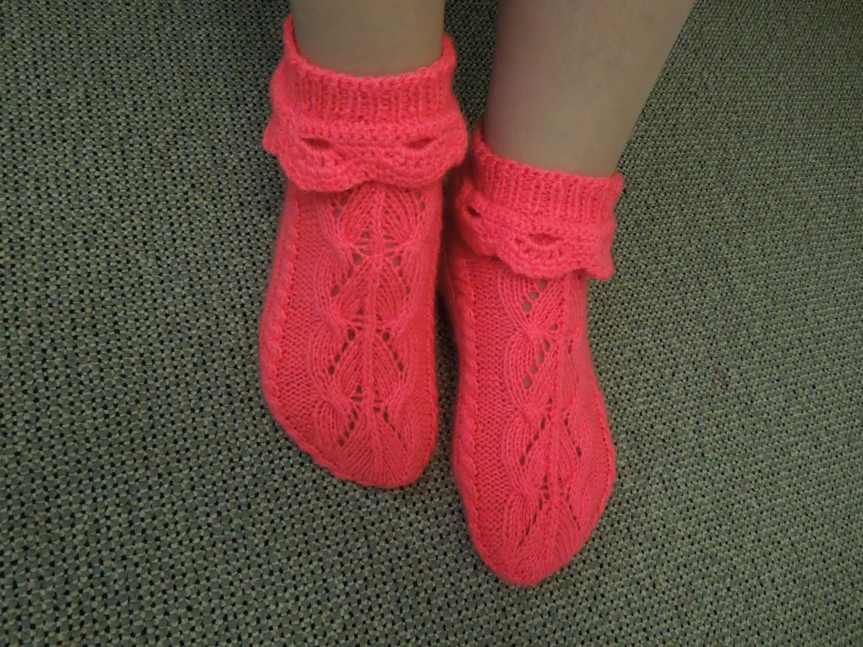 Узор: Раппорт 28 петель. Набрать 28 петель. 1р. 12 лиц, 2 изн, 12 лиц. 2,4,6,8,10р по рисунку. 3р. 8 лиц, 3 вместе с наклоном в право, накид, 1 лиц, накид, 2 изн, надид, 1 лиц, накид, 3 вместе с наклоном в лево, 8 лиц. 5р. 6 лиц, 3 вместе с наклоном в право, 1 лиц, накид, 1 лиц, накид, 1 лиц, 2 изн, 1 лиц, накид, 1 лиц, накид, 1 лиц, 3 вместе с наклоном в лево, 6 лиц. 7р. 4 лиц, 3 вместе с наклоном в право, 2 лиц, накид, 1 лиц, накид, 2 лиц, 2 изн, 2 лиц, накид, 1 лиц, накид, 2 лиц, 3 вместе с наклоном в лево, 4 лиц. 9р. 2 лиц, 3 вместе с наклоном в право, 3 лиц, накид, 1 лиц, накид, 3 лиц, 2 изн, 3 лиц, накид, 1 лиц, накид, 3 лиц, 3 вместе с наклоном в лево, 2 лиц. 11р. 3 вместе с наклоном в право, 4 лиц, накид, 1 лиц, накид, 4 лиц, 2 изн, 4 лиц, накид, 1 лиц, надид, 4 лиц, 3 вместе с наклоном в лево. Повторить узор с 1-го ряда. Вяжем по схеме 3 мотива. Набираем по бокам петли и вяжем 6 рядов плат. вязкой. Мысок вязать как пятку носка на средних 16 петель пока не свяжете мысок. На спицах 16п. Набираем по бокам из цепочки петли и вяжем прямо до нужной длины плат. вязкой. Закрываем пятку на средних 10 петель. На спицах 10 петель. Теперь набираем еще петли по кругу. Далее я вязала резинкой 1*1 до нужной длины. Петли закрыть. РюшкаДелаем 3 воздушных петли для подёма. Теперь вяжем столбик с накидом и воздушную петлю. И так до конца ряда. Столбик с накидом идет как раз в лицевую петлю. Получатся как квадраты. Сдедущий ряд 6 столбиков с накидом. На другой стороне квадрата вяжем так же 6 столбиков с накидом Вяжем как бы зигзагом