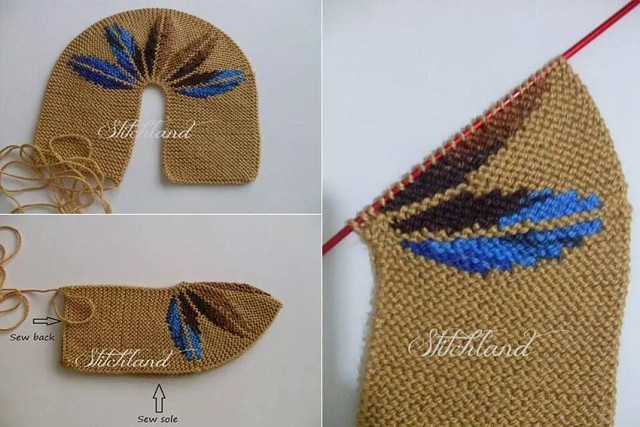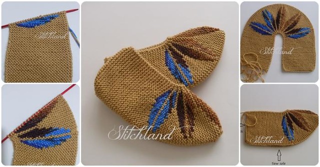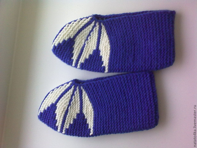 Турецкие тапочки можно вязать и другим способом. Для этого боковую сторону вяжут в два раза уже, а петли для подошвы набирают от мыска. В процессе вязания подошвы кромочные петли боковой части подбираются в каждом ряду, и тапочек получается без шва.