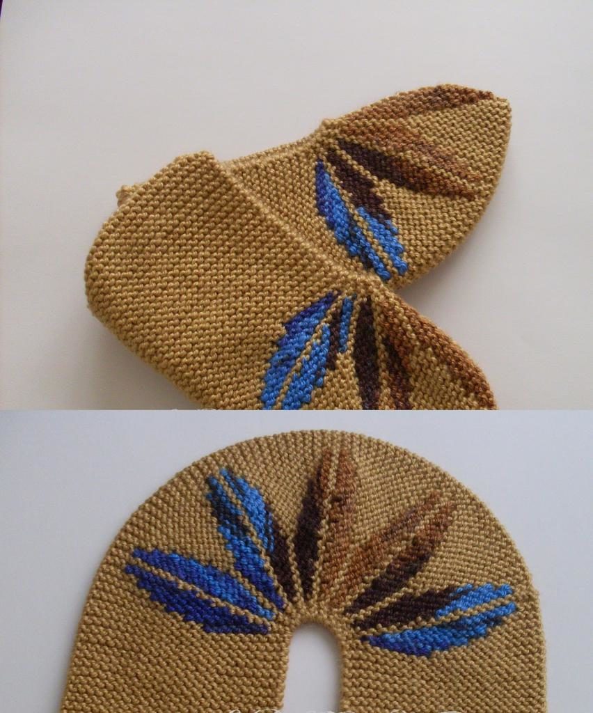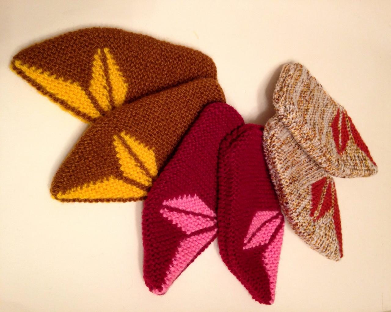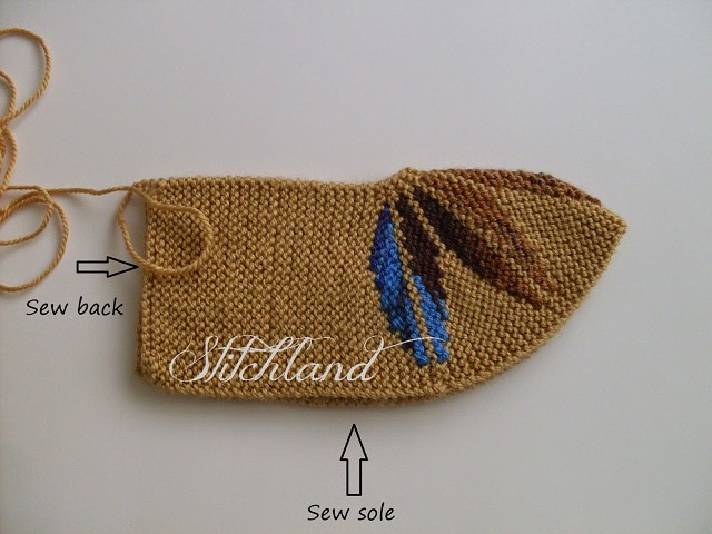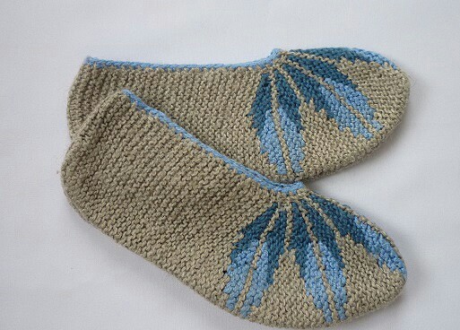 Начинается работа от задника. До начала мизинца полотно ровное. Для тапочек 37-39 размера его ширина составляет примерно 7-8 сантиметров. Это 26 петель на спицах № 3,5. Мысок вывязывается укороченными рядами. Обычно это три-четыре клина по 14 рядов. В первом ряду мыска вяжется 9 петель, работа переворачивается и выполняется изнаночный ряд. В следующем лицевом ряду провязывается на три петли больше, работа снова переворачивается. Таким образом, через 14 рядов будут провязаны все 26 петель. Образовавшийся первый клин немного изменит направление вязания. Когда все клинья будут связаны, полотно будет симметрично продолжаться в обратную сторону, к пятке. Плоский соединительный шов выполняют по центру подошвы и задника.