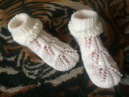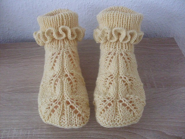 Узор: Раппорт 28 петель. Набрать 28 петель. 1р. 12 лиц, 2 изн, 12 лиц. 2,4,6,8,10р по рисунку. 3р. 8 лиц, 3 вместе с наклоном в право, накид, 1 лиц, накид, 2 изн, надид, 1 лиц, накид, 3 вместе с наклоном в лево, 8 лиц. 5р. 6 лиц, 3 вместе с наклоном в право, 1 лиц, накид, 1 лиц, накид, 1 лиц, 2 изн, 1 лиц, накид, 1 лиц, накид, 1 лиц, 3 вместе с наклоном в лево, 6 лиц. 7р. 4 лиц, 3 вместе с наклоном в право, 2 лиц, накид, 1 лиц, накид, 2 лиц, 2 изн, 2 лиц, накид, 1 лиц, накид, 2 лиц, 3 вместе с наклоном в лево, 4 лиц. 9р. 2 лиц, 3 вместе с наклоном в право, 3 лиц, накид, 1 лиц, накид, 3 лиц, 2 изн, 3 лиц, накид, 1 лиц, накид, 3 лиц, 3 вместе с наклоном в лево, 2 лиц. 11р. 3 вместе с наклоном в право, 4 лиц, накид, 1 лиц, накид, 4 лиц, 2 изн, 4 лиц, накид, 1 лиц, надид, 4 лиц, 3 вместе с наклоном в лево. Повторить узор с 1-го ряда. Вяжем по схеме 3 мотива. Набираем по бокам петли и вяжем 6 рядов плат. вязкой. Мысок вязать как пятку носка на средних 16 петель пока не свяжете мысок. На спицах 16п. Набираем по бокам из цепочки петли и вяжем прямо до нужной длины плат. вязкой. Закрываем пятку на средних 10 петель. На спицах 10 петель. Теперь набираем еще петли по кругу. Далее я вязала резинкой 1*1 до нужной длины. Петли закрыть. Рюшка Делаем 3 воздушных петли для подёма. Теперь вяжем столбик с накидом и воздушную петлю. И так до конца ряда. Столбик с накидом идет как раз в лицевую петлю. Получатся как квадраты. Следущий ряд 6 столбиков с накидом. На другой стороне квадрата вяжем так же 6 столбиков с накидом , вяжем как бы зигзагом.