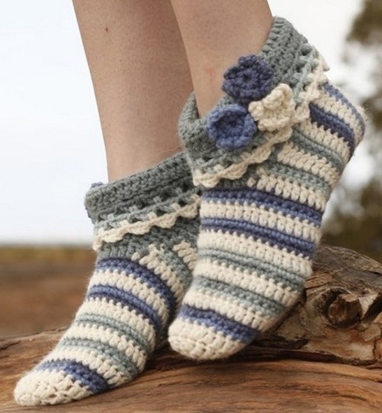 Тапочки-носочки «Аннабель»от Drops DesignKlubokhttp://klubok.work/1/53/7355/Klubokhttps://klubok.work/css/image/top-logo-en.pngПредлагаем вам связать тапочки-носочки от студии Drops Design крючком, которые подарят вашим ножкам комфорт, позволят расслабиться после трудового дня. Вязаная «одёжка» для ножек имеет свои плюсы: во-первых, она легко стирается, во-вторых, её не нужно снимать, когда вы забираетесь с ногами в кресло. Размер: 35-37; 38-40; 41-43 Стопа: 22 - 24 - 27 см Пряжа: шерсть 65%, альпака 35%; 50 г/75 м Белая – 100 г Синяя, джинсовая синяя, светлый серо-зелёный, серо-зелёный – по 50 г Плотность вязки: 10 см в ширину=17 ст. с/н Инструмент: крючок 4 мм. Совет! Во всех рядах из ст. с/н: вяжем вместо первого ст. с/н 3 возд. п., ряд завершаем соед. п. в 3 возд. п. Во всех рядах из ст. б/н: вяжем возд. п. вместо первого ст. б/н, ряд завершаем соед. п. в первую возд. п. Описание Полоски вяжем, протягивая пряжу белого цвета с изн. стороны, пряжу остальных цветов обрезаем, провязав полосу. ряды из ст. б/н вяжем пряжей в следующей последовательности: 1 полоса - светло-серо зелёная 2 полоса - серо-зеленая 3 полоса - белая 4 полоса - серо-зеленая 5 полоса - светло-серо зелёная 6 полоса - белая 7 полоса - джинсово-синяя 8 полоса - синяя 9 полоса - белая 10 полоса - синяя 11полоса - джинсово-синяя 12 полоса - белая Повторяем 12 рядов. Убавления. Убавляем ст. с/н, провязывая ст. с/н вместе: выполняем ст. с/н в след. ст. б/н, без посл. протяжки, вяжем еще ст. с/н в след. ст. б/н так же, накид, нить пропускаем через все п. на крючке. Тапочку вяжем по кругу, начиная от носка. Вяжем белой пряжей 5 возд. п., формируем кольцо соед. п. в 1-ю возд. п. Ряд №1: в кольцо 12 ст. с/н, начало ряда (середина стопы). Ряд №2: * ст. с/н в первый ст. с/н, 2 ст. с/н в след. ст. с/н *, повтор до конца ряда *-*. Получаем 18 ст. с/н. Ряд №3: * по ст. с/н в первые 2 ст. с/н, 2 ст. с/н в след. ст. с/н *, повтор до конца ряда *-*. Получаем 24 ст. с/н. Ряд №4 (синяя пряжа): * по ст. б/н в первые 3 ст. с/н, 2 ст. б/н в след. ст. с/н *, повтор до конца ряда *-*. Получаем 30 ст. б/н Ряд №5 (джинсово-синяя пряжа): вяжем по ст. б/н в каждый ст. б/н, при этом равномерно прибавляем 4-6-10 ст. б/н. Получаем 34-36-40 ст. б/н. Ряд №6 (белая пряжа): по ст. с/н в каждый ст. б/н. Дальше вяжем полосами, когда длина изделия будет 12-13-15 см, останавливаемся после двух р. из ст. б/н, нить обрезаем. Устанавливаем метку между центральными петлями в р. (т.е. после 17-18-20 ст. с/н). Вяжем изделие, чтобы носок тапочки смотрел на вас, отступаем влево 4 п. от метки и начинаем вязать с ЛС белой пряжей ст. с/н. Вяжем, чтобы до конца ряда осталось 6 ст. б/н (по 3 п. с каждой стороны от метки), разворачиваемся. Вяжем полосы как раньше — выполняем соед. п. в первый ст. с/н и далее ст. б/н до предпоследнего ст. с/н, разворачиваемся. Далее вяжем прямыми и обратными р. по оставшимся 26-28-32 п., пока изделие станет 21-23-26 см, останавливаемся, когда след. р. будет белой пряжей из ст. с/н. След. р.: по ст. с/н в первые 11-12-14 ст. б/н, след. 4 ст. с/н вяжем по 2 вместе, дальше вяжем по ст. с/н в посл. 11-12-14 ст. б/н. Обрезаем нить, складываем тапочку пополам и делаем с тыльной стороны шов. Голень вяжем с заднего шва. Вяжем 40-42-44 ст. с/н серо-зеленой пряжей по верхнему краю. Вяжем по кругу 6 р. из ст. с/н. В след. р. равномерно добавляем 8-9-10 ст. с/н. Итого 48-51-54 ст. с/н. Далее вяжем отгибной край. Чтобы он выглядел красиво, разворачиваемся и вяжем с ИС. Ряд №1: * пико (= 4 возд. п., в первую возд. п. ст. с/н), пропускаем 2 ст. с/н, ст. б/н в след. ст. с/н *, повтор до конца ряда *-*, вместо посл. с