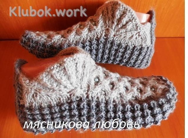 Тапочки Klubokhttp://klubok.work/1/53/7356/Klubokhttps://klubok.work/css/image/top-logo-en.pngНабираем 47 петель ( 2 раппорта узора * алсацийские гребешки* +3 +2 кр. Вяжем этим узором 1 раппорт в высоту. Делим вязание на 3 части - Кр 12 петель- 21 петля -12петель Кр. Вяжем язычок на центральных 21 петлях. узором *жгут *цепочка *на нужную Вам длину. у меня 42 ряда. Коса в виде цепочки Набрать количество петель, кратное 22 + 3 доп. петли. 1-й р. (лиц. стор.): 3 изн., *8 лиц., 3 изн., повт. от *. 2-й р. и все четные ряды (изн. стор.): 3 лиц., *8 изн., 3 лиц., повт. от *. 3-й р.: 3 изн., * 8 лиц., 3 изн., С4В, С4Ф, 3 изн., повт. от *. 5-й р.: 3 изн., *С4В, С4Ф, 3 изн., 8 лиц., 3 изн., повт. от *. 7-й р.: 3 изн., *8 лиц., 3 изн., С4Ф, С4В, 3 изн., повт. от *. 9-й р.: 3 изн., *С4Ф, С4В, 3 изн., 8 лиц., 3 изн., повт. от *. Условные сокращения для всех узоров: С4Ф : 4 петли перекрестить налево ( 2 п. отложить перед работой на вспом. спицу, след. 2 п. провязать лиц., затем провязать 2 лиц. п. со вспом. спицы.) С4В : 4 петли перекрестить направо ( 2 п. отложить за работой на вспом. спицу, след. 2 п. провязать лиц., затем провязать 2 лиц. п. со вспом. спицы.) Ряды со 2-го по 9-й образуют узор. В последних рядах взани язычка я постепенно. согласно узору. убавила ширину зычка до 10 петель. Мысок получается закругленным. а не квадратным.13:48 Набираем по боковинкам язычка петли из кромочных. у мен получилось по 21 петле. Начинаем вязать узором *кукурузка* - Кр. 12 петель с запасной спицы. - 21 петл боковинки язычка - 10 центральных петель язычка - 21 петл с другой боковинки - 12 петель с запасной спицы -Кр. ВСЕГО 76 ПЕТЕЛЬ + 2 КР Описание узора: 1ряд – резинка 1х1 (1кром, 1 лицевая, 1изн,…., закончить 1 лиц, 1 кром). 2ряд – лицевые провязываются лицевыми, изнаночные с накидом снимать не провязывая. 3ряд – к петле с одним накидом добавляем второй накид и вместе петлю перекидываем на правую спицу не провязывая, изнаночные провязываем лицевыми. 4ряд – петлю с двумя накидами провязываем изнаночной, изнаночные – лицевыми. Провязала 5 раппортов узора *кукурузка ( 20 рядов). Н а 10 центральных петлях начала вязать подошву. как пятку у носка.Провязав подошву. набрала на заднике с 2 сторон по 17 петель и провязала задник узором. что и язычок. когда задник связан. провязала еще 2 ряда. убавл в каждом ряду по 2 петли. и закрываем. Текстовое описание вязания спицами одного раппорта узора «алсацийские гребешки» 1-й ряд: вязать лицевыми 21 петлю. 2-й ряд: вязать изнаночными 21 петлю. 3-й ряд: вязать лицевыми 21 петлю. 4-й ряд: накид, 21 петлю вязать лицевыми. 5-й ряд: * одна изнаночная петли, три петли лицевые *, повторить действия между звездочками еще четыре раза; две изнаночные. 6-й ряд: лицевая петля; накид; лицевая петля; * три изнаночные, одна лицевая *,повторить операции между звездочками еще четыре раза; накид. 7-й ряд: две изнаночные петли; * три лицевые, изнаночная петля *, повторить действия между звездочками еще четыре раза; две изнаночные. 8-й ряд: лицевая петля; накид; лицевая петля; накид; * две петли лицевой с наклоном влево, две изнаночные петли *, повторить действия между звездочками еще четыре раза; лицевая петля; накид; лицевая петля; накид. 9-й ряд: четыре изнаночные петли; * две лицевые петли, одна изнаночная петля *, повторить действия между звездочками еще четыре раза; четыре изнаночные петли. 10-й ряд: * лицевая петля, накид *, повторить действия между звездочками еще три раза; * две петли лицевой с наклоном влево, изнаночная петля *, повторить еще четыре раза; * лицевая петля, 
