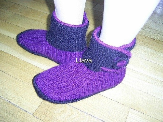 Тапочки Klubokhttp://klubok.work/1/53/7375/Klubokhttps://klubok.work/css/image/top-logo-en.pngВязаные тапочки Описание. Пряжа ALIZE superlana maxi Турция 25 % wool 75 % akrilik,ушло 100 гр. фиолетового цвета и 50 гр. чёрного цвета,спицы 3,5. Связать подошву по форме ноги,желательно вязать две подошвы одновременно,во избежании расхождения.В моём варианте чёрного цвета. Поднять петли по периметру подошвы,у меня 92 петли,размер ноги 35-36,фиолетовая нить,провязать по кругу 4-ре ряда резинкой 1*1,дальше отметить средние петли на мыске,у меня 17 петель,и вязать как мы вяжем пятку у носка,провязывая последнюю петлю центрального отрезка мыска и петлю с подошвы вместе лицевой с наклоном в право,повернуть вязание. В изнаночном ряду последнюю петлю отрезка мыска и петлю с подошвы провязать вместе изнаночной,повернуть вязание. Так вязать пока на спицах не останутся 60 петель,дальше продолжить вязание по кругу,делая убавления в тех же местах.На спицах должно остаться 48 петель,дальше переходим на чёрную нить (этот ряд вяжем лицевыми) и делаем равномерное убавление (5 лиц.,2 вместе лицевой),должно остаться 40 петель на спице.Переходим на платочную вязку,во всех рядах вязать лицевыми,вяжем по кругу. Провязав 4-5 рядов расторгаем круг,набираем дополнительно 10 петель для застёжки,вяжем 4-5 рядов,делаем петлю для пуговицы,снова вяжем 4-5 рядов,закрываем все петли.Бота готова,аналогично вяжем вторую. Обвязать подошву и верх бот рачьим шагом,связать пуговку,пришить её на нужное место.