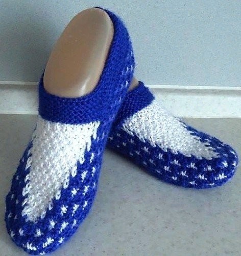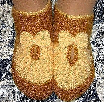 ОРИГИНАЛЬНЫЕ ТАПОЧКИKlubokhttp://klubok.work/1/53/7399/Klubokhttps://klubok.work/css/image/top-logo-en.pngОПИСАНИЕ Набрать на спицы 51 петлю тёмной нитью, провязать 8 рядов платочной вязкой. Затем разделить все петли на три части: 17+17+17, и вязать только среднюю часть чулочной вязкой. Боковые петли временно снимаем на большие булавки. Провязав 10-12 см, у нас получится прямоугольник. Петли не закрываем. По бокам прямоугольника набираем дополнительные петли (примерно 23-25) нитью светлого цвета. Вывязываем «зубчики» по трём сторонам прямоугольника: 4 ряда вяжем чулочной вязкой, 5 ряд — кромочную петлю снять, *2 петли вместе лицевой, накид* — до конца ряда. Ещё провязываем 3 ряда чулочной вязкой. Складываем вязание по тому ряду, где у нас накиды и соединяем начальный ряд с последним путём вывязывания: 1 петля с первого ряда и одна петля с последнего ряда провязать вместе лицевой. Затем подключаем в работу петли с булавок и вяжем платочной вязкой высоту тапочка 3-4 см тёмной нитью. Переходим на вязание подошвы.Для этого отметим средние 12 петель и вяжем их укороченными рядами, пока не закроем все боковые петли. Для вывязывания пятки по краям набираем высоту тапочка с двух сторон по 16-18 петель. Вяжем укороченными рядами средние 12 петель как пятку в носке. Верх тапочек обвязать «зубчиками». Подшиваем иглой. Готовые тапочки можно украсить по желанию. Начинаем вязать сверху зубцы (первым цветом), набираем 50 петель и вяжем 5 рядов чулочной вязкой, 6 ряд-1 кромоч. *накид, 2 вм.лиц.*, 1 кром. Потом опять 5 рядов чулочной вязкой После подшиваем зубцы спицей Затем 3 платочной вязкой вторым цветом После делим петли на три части и вяжем только среднюю часть Переходим на первый цвет и набираем кромочные петли средней части для вывязывания зубцов. Зубцы вяжем сверху: 4 ряда-чулочной вяз.; 5 ряд-1кром., *накид, 2 вм.лиц., *1 кром., потом опять 4 ряда чулоч.,вязкой После подшиваем зубцы спицей Затем вторым цветом на всех петлях башмачка вяжем платочной вязкой 1,5-2 см (полнота башмачка). Снова вяжем первым цветом зубцы — 4 ряда чулочной вязкой, 5 ряд — 1кром., *накид,2 вм.лиц.*, 1 кром., после опять 4 ряда чулоч. вязкой. После подшиваем зубцы спицой. Переходим на подошву которую вяжем вторым цветом платочной вязкой когда начинаешь вязать подошву. нужно убавлять в каждом втором ряду первые две петли вместе..потом две вместе перед центральной петлёй..провязываем центральную петлю и опять две вместе и две последние вместе Набрать на спицы 51 петлю тёмной нитью, провязать 8 рядов платочной вязкой. Затем разделить все петли на три части: 17+17+17, и вязать только среднюю часть. Боковые петли временно снимаем на большие булавки. Среднюю часть можно украсить любым рисунком. Например «бабочки».
