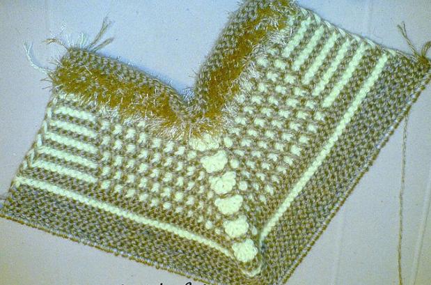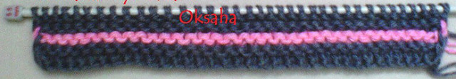 Отмечаем среднюю петлю, из неё будем делать прибавки Теперь, чтобы не сбиться, будем считать ряды с первого (это потому, что манжетку вязали 8 и 10 рядов) 1 ряд: лицевые петли. Из средней петли вывязываем 7 петель - далее будем называть "РАКУШКА" (провязываем одну петлю, не снимая петли с левой спицы делаем накид и опять провязываем петлю ... и так должно получиться семь). Лицевые петли. Ракушку вяжем очень слабо, т.е. делаем очень вытянутые петли.