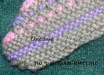 После того как все связали делим работу на две спицы. И начинаем закрывать подошву. Снимаем среднюю петлю на крючок. Захватываем петлю со спицы и протягиваем через эту петлю. Затем захватываем петлю с другой спицы и опять протягиваем через образовавшуюся петлю и так до конца тапочка. Затем сшиваем заднюю часть.