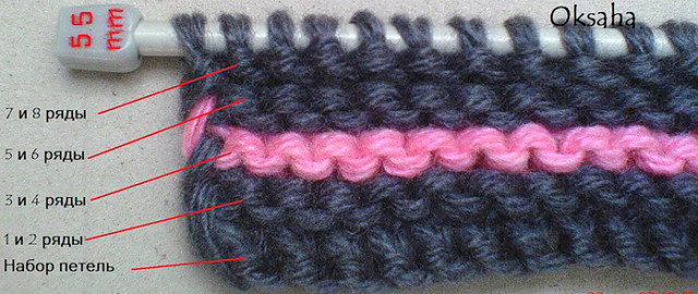 2 ряд: лицевые петли. Количество петель увеличится на 6,если было 35, то будет 41, если было 41, то будет 47. 3 ряд: лицевые петли 4 ряд: лицевые петли 5 ряд: лицевые петли - РАКУШКА - лицевые петли 6 ряд: лицевые петли 7 ряд: лицевые петли 8 ряд: лицевые петли 9 ряд: лицевые петли - РАКУШКА - лицевые петли 10 ряд: лицевые петли. Вяжем так пока не получим 5 или 6 РАКУШЕК - в зависимости от нужного размера