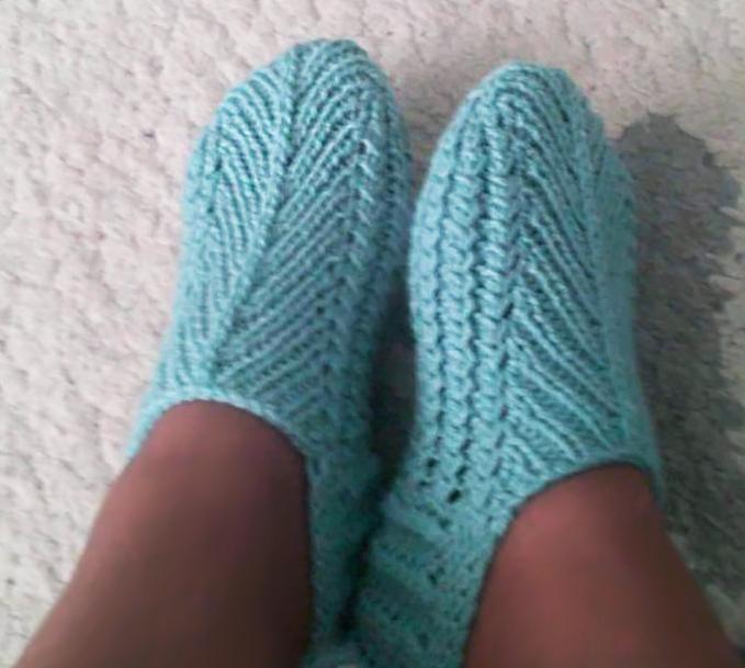 Размер 38-39. Спицы №3, пряжа 150 м. на 100 гр. Набрать на спицы 24 петли и вязать платочным узором 6 рядов. Затем прибавить сразу 7 петель. На спицах должно получиться 31 петля. Далее вяжем узор : 1 ряд = 1 кром., *из 2 лиц петель вяжем 2 лицевые(две вместе, не снимая вяжем вторую лицевую петлю из первой), 1 изн.* , повторяем до конца ряда . 2 ряд = на изнаночном ряду все петли по узору. Повторяем чередую первый и второй ряд на высоту пятки. Вывязываем пятку - делим все петли на 3. 1 лишнюю оставляем на внутренней части пятки. 10 петель лицевых. Далее плетенка ( из двух петель две - повторить 4 раза, 1 лиц.) 21 петлю и 22 вяжем вместе одной лицевой петлей. Поворачиваем вязание в обратную сторону и вяжем - кромочная, 9 изн., 10 и 11 вяжем вместе одной изнаночной петлей. Поворачиваем обратно - кромочная, 1 лиц., из 2х 2 - повторить 4 раза. две вместе и т.д. пока на спицах не останется 11 петель. Добираем петли по боковым сторонам пятки и вяжем далее на длину подошвы. Убавления делаем только на боковых сторонах полотна , не трогая подошву. На спицах должно остаться 17 петель. Переходим к вязанию верхней части следков. кромочная., вяжем далее резинкой 1х1 7 петель, 3 вместе, опять резинка 1х1., добираем петлю из кромочной и поворачиваем вязание в обратную сторону. Вяжем по узору . В конце ряда добираем петлю из кромочной петли. Вяжем так пока не закроем всю верхнюю часть следков. Закрыть все петли.