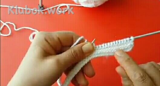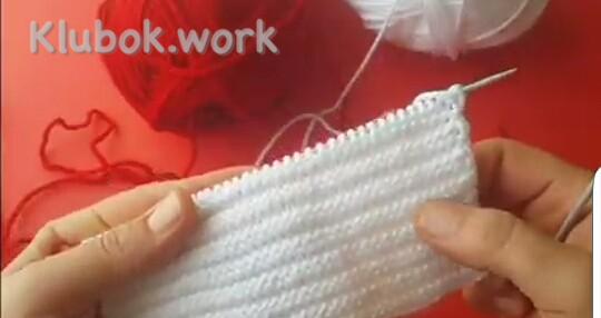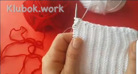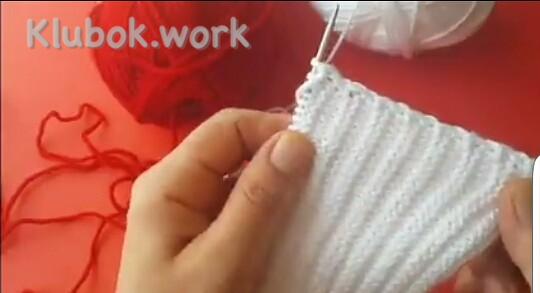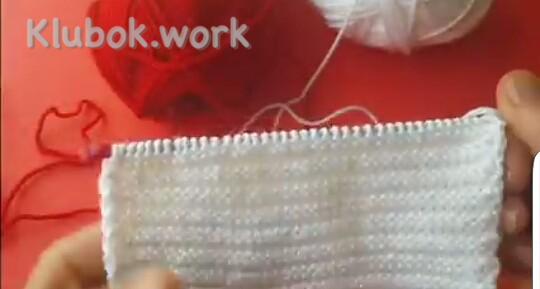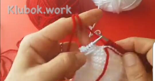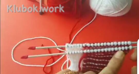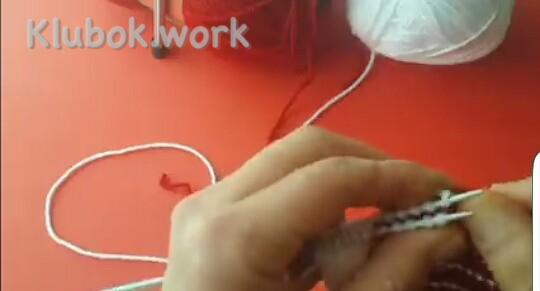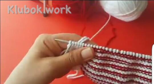 Дальше добавляем 2-й цвет, здесь красный 1 ряд : кр снять , 5 изн белых , 28 лиц красных , поворачиваем 2 ряд , кр снять , 27 изн красных , 5 белых распускаем на ряд и одеваем на левую спицу вместе с кромочной , поворачиваем 3 ряд : кр снять , все изн белые , кр изн 4 ряд : кр снять , все лиц белые , кр изн Повторяем 1- 4 ряды , пока не будет 9 красных полосочек