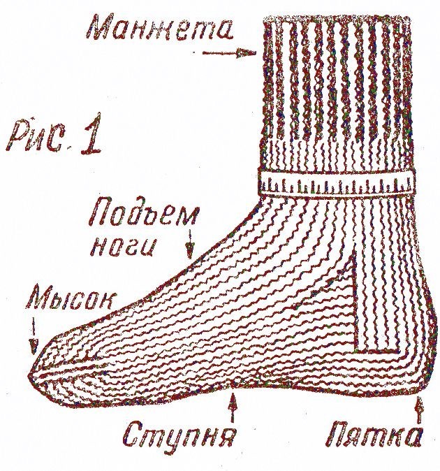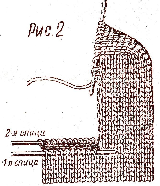 По контрольному образцу узора основной части носка (не манжеты) определите плотность вязания. Например, 3 петли в 1 см, спицы № 2,5. Подсчитайте число петель, необходимое для начала работы: 23 см х 3 п = 69 п. Это число (69) округлите до четного в сторону увеличения. (Удобнее, если оно будет делиться на 4 без остатка, так как петли распределяют на 4 спицы). В данном примере лучше взять число 72, тогда на каждой спице будет по 18 петель (носки 36-го - 37-го размера). НАЧАЛО ВЯЗАНИЯ НОСКА. Для тренировки свяжите небольшой носок на 40 петель. Наберите их на 2 спицы, сложенные вместе. Освободите одну из них и очень туго провяжите один ряд резинкой 1х1, одновременно распределяя петли на 4 спицы по 10 петель на каждую. Таким образом будут в работу введены 4 спицы, свободная 5-я - рабочая. К петлям 1-й спицы приколите булавку или пришейте цветную нить: в дальнейшем эта спица будет ориентиром в работе. Затем конец нити, оставшийся при наборе петель, свяжите узлом с рабочей нитью, вязанье образует круг (кромочных петель больше нет). Далее вяжите с внешней стороны круга по часовой стрелке 4-5 см резинкой 1х1. Выполнив ее, переходите на чулочное вязание и свяжите 5 см до щиколотки. ВЫВЯЗЫВАНИЕ ПЯТКИ. Разделите вязанье на две равные части и дальше вяжите только петли двух спиц: 3-й и 4-й (петли 1-й и 2-й в образовании пятки не участвуют). Чтобы работать было удобнее, сначала провяжите петли с двух спиц на одну (с 3-й и 4-й) и затем свяжите прямое полотно чулочной вязкой - высоту пятки. Высоту полотна определяют так: число кромочных петель полотна должно равняться количеству петель на одной спице. В данном примере должно быть 10 кромочных (20 рядов). После этого вязание приостановите, закончив его лицевым рядом. Теперь полотну нужно придать форму пятки. Достигается это убавлением петель внутри полотна. Разделите количество петель, включая кромочные, на 3 части. Если число не делится на 3, то остаток прибавьте к средней части. В данном случае распределите так: по 6 петель для боковых частей и 8 петель - для средней. Начинайте убавления. 1-й р я д (изнаночная сторона полотна) - изнаночные петли: свяжите 6 петель первой боковой части, затем все петли средней части, кроме последней - ее провяжите изнаночной вместе с соседней петлей второй боковой части (остальные 5 петель второй боковой части остались непровязанными). Вязанье поверните. 2-й р я д (лицевая сторона полотна) - лицевые петли: кромочную снимите и туго подтяните к спице, далее свяжите все петли средней части, кроме последней - ее провяжите вместе с соседней петлей первой боковой части лицевой за заднюю стенку. Вязанье поверните. Повторяйте прием, пока не провяжете все петли боковых частей с крайними петлями средней части (работа должна закончиться провязыванием лицевого ряда). На спице останутся только петли средней части (8 петель). При вязании пятки к шерстяной нити можно присоединить капроновую или другую прочную нить. Закончив вывязывание пятки, капроновую нить оборвите и продолжайте вязать одной шерстяной. В я з а н и е н о с к а д о у б а в л е н и й н а м ы с к е. Эту часть носка вяжите опять по кругу лицевыми петлями. Начинайте работу так: спицей, на которой находятся петли средней части, наберите новые петли по лицевой стороне носка из кромочных пятки - из каждой кромочной по одной лицевой, всего 10 петель (рис.2).