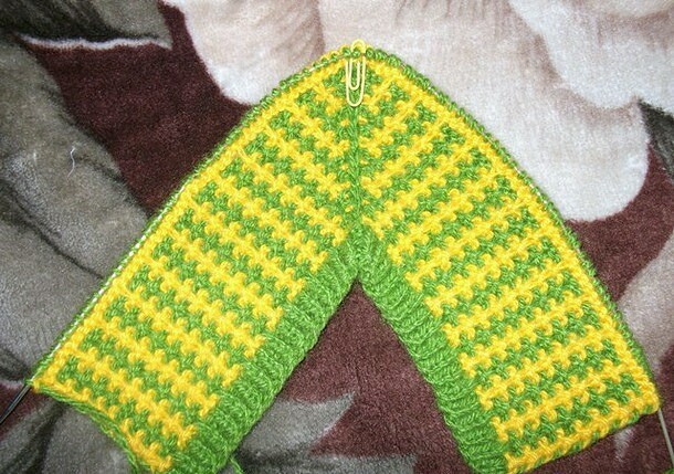 Дальше продолжаем так 1-й ряд после резинки лицевой, вязать другим цветом (ДЦ): 3п лицевые(кромочную тоже считаем и провязываем),1 п. снять(нить за работой) и т. д. вязать до середины. Перед ЦП 2 лиц., затем поднять 1 петлю из предыдущего ряда и провязать её скрещенной. Далее ЦП снять не провязывая(нить за работой), снова 1 скрещенная из предыдущего ряда,2 лицевые,1 снять(нить за работой),3 лицевые и т. д. В конце 2 лиц. и 1 изнаночная(кромочная) 2 ряд(изнаночный):1-ю п. снять(кромочная),2 лиц.,1 п. снять(нить перед работой),3 лиц.,1 п. снять(н. п. р.) и т. д. В конце ряда 2 лиц.,1 изн.(кромочная) 3-й ряд лицевой, вязать ОЦ:1 лиц.(кромочная),1 снять(н. за р.),3 лиц. и т. д. до середины. Перед ЦП 1 лиц.,1 скрещ. из предыд. ряда, ЦП провязать лицевой,1 скрещ. из пред ряда,1 лиц.,1 п. снять(н. за р.),3 лиц, и т. д. В конце ряда 1 п. снять(н. за р.),1 изн.(кромочная). 4-й ряд(изнаночный):1 п. снять(кромочная),1 п. снять(н. перед р.),3 лиц., и т. д. Перед ЦП 2 лиц., ЦП провязать изнаночной. Далее 2 лиц.,1 п. снять(н. перед р.),3 лиц. и т. д. 5-й ряд(лицевой) вязать ДЦ.-как 1-й ряд.6-й ряд-как 2-й.7-й ряд ОЦ -как 3-й.8-й ряд-как 4-й. Обращаю внимание, во первом ряду ЦП снимается, в третьем провязывается лицевой И так вяжем, пока на спицах не будет 101 петля, т. е. 8 повторов 1 -4 рядов И 8 рядов рисунка
