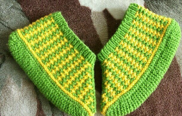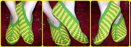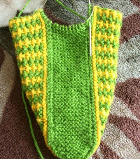 и переходим к подошве. 1 ряд - провязаваем 49 петель боковины и начинаем мысок.3 петли лицевыми,2-е петли вместе лицевой,1 лицевая, поворачиваем вязание 2 ряд - 4 лицевых,2-е вместе лицевой,1 лицевая, поворачиваем вязание и т. д. Т. е доходим до прорези, провязываем 2-е вместе и +1 лицевая, разворот и пока не получится на подошве 12 петель, потом вяжем как обычную пятку. Так вяжем пока на спицах по бокам не останется по 5 петель.