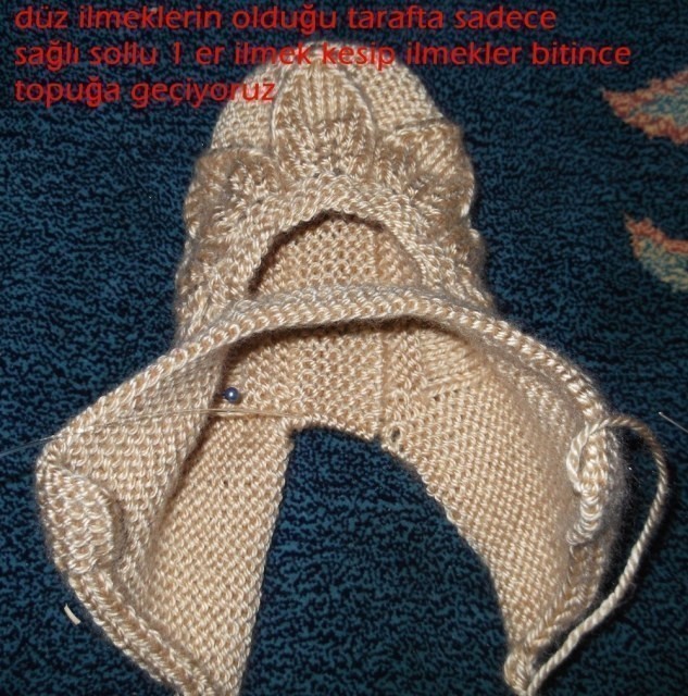 Дальше вяжем подошву На средних 11п. будем вязать подошву. Вяжем подошву платочной вязкой ( все лицевые ) 1 ряд первую снять , 9 лиц , 11 петлю не провязываем , с боковой косички вытягиваем петлю за переднюю стенку , добавляем к ней 11 петлю и провязываем 2 вместе изнаночной Это лицевая сторона. 2 ряд На изнаночной стороне: первую снять, 9 лиц , 11 петлю не провязываем , вытягиваем за заднюю стенку петлю с боковой косички , добавляем к ней 11 петлю и провязываем 2 вместе лицевой Повторяем эти 2 ряда до пятки . Подошва тапка , вяжем до пятки