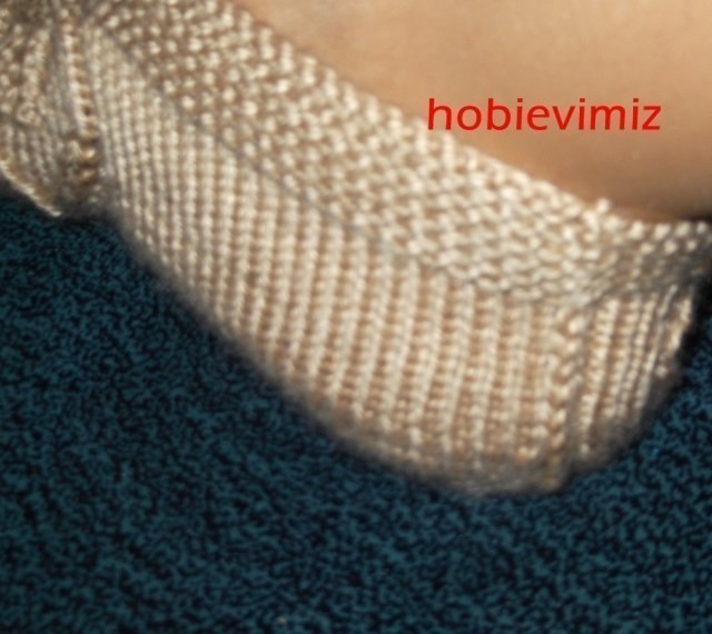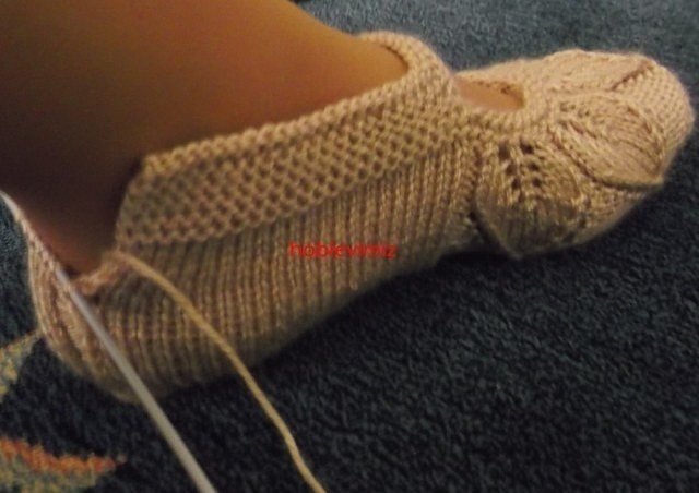 Дальше вяжем пятку , по такому же принципу как и подошву , только чулочной вязкой , потому что боковинки у нас чулочным вязанием и заканчиваем последние ряды платочной вязкой манжета