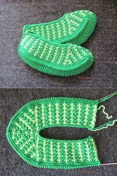 В КОПИЛКУ ЛЮБИТЕЛЕЙ ВЯЗАНИЯ.Тапочки на 2 спицах. Привожу текстовое описание, в принципе можно вязать, руководствуясь только им (удобно, если вязать одноцветные тапочки платочной вязкой, или разноцветные полосками) Набрать 69 петель. Вяжем только лицевыми (н- накид. Цифра- кол-во петель.) Нечетные- лицевые ряды, четные- изнаночные, без изменений. 1р- 34, н, 1, н, 34 =71 3р- 34, н, 1, н, 1, н, 1, н, 34= 75 5р- 34, н, 3, н, 1, н, 3, н, 34= 79 7р- 34, н, 5, н, 1, н, 5, н, 34= 83 9р- 34, н, 7, н, 1, н, 7, н, 34= 87 11р- 34, н,9, н, 1, н, 9, н, 34= 91 13р- 34, н, 11, н, 1, н, 11, н, 34= 95 15р- 34, н, 13, н, 1, н, 13, н, 34= 99 17р- 34, н, 15, н, 1, н, 15, н, 34= 103 19р- 34, н, 17, н, 1, н, 17, н, 34= 107 21р- 34, н, 19, н, 1, н, 19, н, 34=111 23р- 34, н, 21, н, 1, н, 21, н, 34= 115 25р- 28р = 115. НО! Нам же надо вывязать рисунок, поэтому все то же самое привожу в схеме : Итак, набираем 69 петель основной нитью и сразу же переходим на доп. нить рисунка! Т.е 1 ряд мы вяжем доп. нитью. Провязали 2 ряда, поменяли на осн. цвет и еще 2 ряда и т.д... Кто вяжет из 3 цветов, все то же самое- 2 ряда первым цветом, 2- вторым, 2- третим и по новой первым, вторым ,третим, получится как тут. Провязав 28 рядов, обрываем все нити. Переходим к вывязыванию СЛЕДА. Для этого надо переснять 50 петель с левой спицы на правую . Присоединяем нить, вяжем с 51 -ой петли. 1 ряд следа- провязать 14 петель, 2 вместе, поворот. 2р- одну снять (нить перед работой), 13п, 2 вм. изнаночной, поворот. 3р- одну снять (нить за работой), 13п, 2 вм. лицевой, поворот. Повторять 2 и 3 ряды до тех пор, пока на правой и левой спицах не останется по 7 петель. Итого на спицах 7+15+7= 29 петель. Переходим к вывязыванию ПЯТКИ. Пишу, как это делаю я, у вязальщиц наверняка есть свой способ :) -Одну петлю снять, 12 п, 3 вместе лицевой, поворот. След. ряд : 1 снять, 11 п, 3 вм. изнаночной, поворот. Потом: 1 снять, 10п, 3 вм. лицевой, *2 петли переснять с прав. спицы на левую, 3 вм. лицевой*- повторяем 5 раз НЕ ПОВОРАЧИВАЯ вязание, все на одной стороне (таким образом на левой спице нет петель, на правой- 13 п). Теперь поворачиваем, правая спица стала левой. Одну петлю переснять на прав. спицу (нить перед работой), 4п., 3 вм. изнаночной, *2 петли переснять на правую спицу, нить перед работой, 3 вм. изнаночной* - так же повторяем 5 раз НЕ ПОВОРАЧИВАЯ вязание! У нас должна остаться одна петля . Теперь я просто вставляю в эту петлю крючок и столбиками без накида зашиваю задник, и не обрывая нити, обвязываю край. Теперь надо спрятать все кончики внутри тапочка и готово!