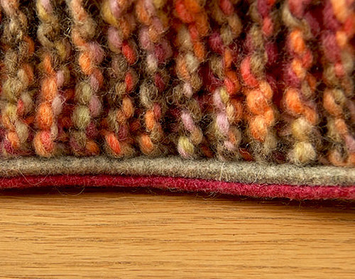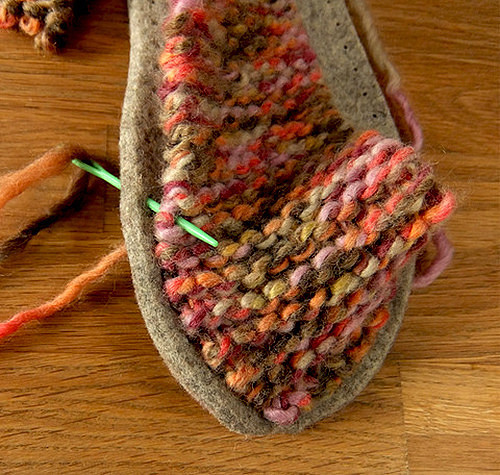 ШАГ 2 Начать сборку тапочка нужно с мыска, пришивая к простой войлочной подошве в первую очередь часть полосы с оставленной нитью. Сначала нужно пришивать ту часть полоски, которая будет внешней стороной тапочка. На каждое отверстие в подошве должен приходится 1 рубчик платочной вязки! Здесь вы можете не следить за аккуратностью стежков, т.к. они будут зарыты второй подошвой из войлока.