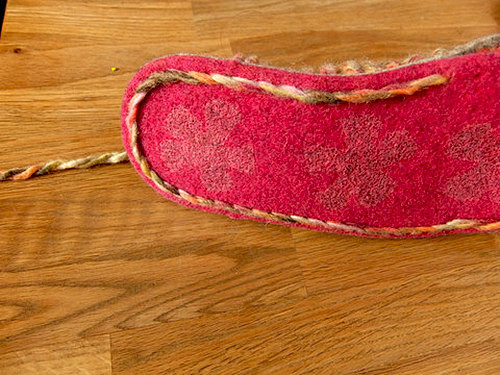 ШАГ 3 Дойдя до первого стежка (= до мыска тапочка), пришейте к подошве, двигаясь в том же направлении, короткую сторону тапочка, затем аккуратно скрепите ее с бортиком. Аккуратно подшейте ту короткую сторону полоски, которая оказалась внутри. Нитками, устойчивыми к истиранию или той же пряжей, из которой связаны тапочки, аккуратно и плотно пришейте вторую стельку, скрепляя ее с первой отверстием к отверстию. Вы можете использовать для сшивания любой вид шва, который кажется вам уместным. В данном мастер-классе использован шов «назад иголку».