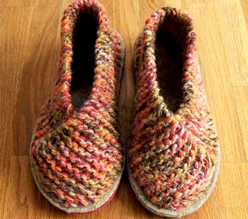 Домашние тапочки спицамиKlubokhttp://klubok.work/1/53/7510/Klubokhttps://klubok.work/css/image/top-logo-en.pngПростые домашние тапочки с войлочной подошвой, которые за считанные часы смогут связать даже новички! ВАМ ПОТРЕБУЕТСЯ Пряжа (51% шерсти, 49% полиакрила ) 50 г меланжевой для размеров меньше 35, 100 г для размеров 35-40; 150 г для тапочек размера 41 и больше; спицы №5,5; по 2 войлочных стельки нужного размера с пробитыми отверстиями для каждого тапочка: одна простая, а другая с латексным нанесением на наружной стороне. ВНИМАНИЕ! Вы можете использовать любую другую достаточно теплую и рыхлую пряжу, но тогда вам нужно самостоятельно определить необходимое количество петель для вязания полосы нужной ширины. ПЛОТНОСТЬ ВЯЗАНИЯ 13 п. х 24 р. = 10 х 10 см ВЫПОЛНЕНИЕ РАБОТЫ ШАГ 1 Наберите на спицы петли: 11 п. для детских тапочек размера 19-34, 12 п. для тапочек размера 34-39, 13 п. для размеров 40-44 и 14 п. для большего размера. Если вы хотите получить более глубокие тапочки, вы можете скорректировать ширину вязаной полосы по ноге. Далее вязать платочной вязкой по прямой. Количество рядов в готовой полосе должно вдвое превышать количество пробитых дырок в стельке, то есть если у вас на стельке, например, 68 дырок, то нужно связать полосу длиной 136 рядов. Окончив вязание, оставьте нить длиной около метра, чтобы пришивать ей полосу к подошве. Можно также использовать другую прочную нить, подходящую по цвету.