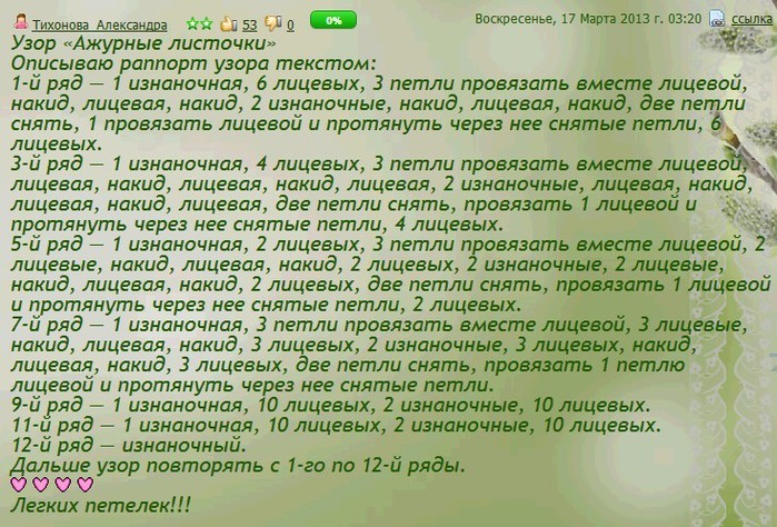 Схема рисунка на изнаночной стороне работы: охохохохоx хохохохохo о- изнаночая петля; х- изнаночная петля, снятая нeпровязанной На лицевой стороне работы все петли вяжутся лицевыми.