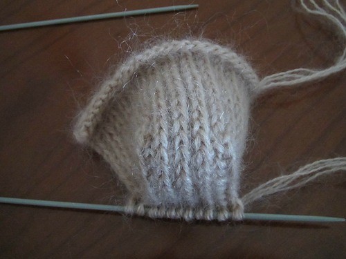 Начинаем на изнаночной стороне работы. Провязав 9 петель указанным выше рисунком (1 из., 1 снимаем, не провязывая) 10 и 11 петли провязываем вместе изнаночной, далее сохраняя рисунок еще 8 петель, 9 и 10 петли провязываем вместе изнаночной. Таким образом у нас на правой спице 19 петель, на левой 9 петель. Не провязывая их, поворачиваем работу на лицевую сторону и снимаем с левой спицы первую петлю не провязывая, 8 петель лицевой, 9 и 10 вместе лицевой за заднюю стенку. На левой спице остается 8 петель. Не провязывая их, поворачиваем работу на изнаночную сторону и снимаем первую петлю не провязывая ее, вяжем 8 петель по выше указанному рисунку (1из., 1 снимаем не провязывая, нить перед петлей). 9 и 10 провязываем вместе изнаночной.Продолжаем таким образом до тех пор, пока не закончится сокращение петель с обоих сторон колпачка пятки. На фотографии колпачок пятки.