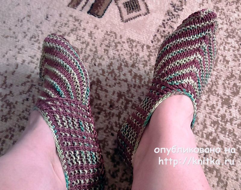 Размер 38-39. Спицы 3,5. Акрил 100% (100г=300м). Набрать 54 п. бордовой нитью. Узор: 1 ряд- бордовая нить- кром., 24 п. лиц., накид, 1 лиц., накид, 2 лиц. (это будут центральные петли), накид, 1 лиц., накид, 24 лиц., кром. 2 ряд- бордовая нить- все изнан. Накиды я провязывала скрещенной петлей. 3 ряд- зеленая нить- кром., 3 лиц., 1 снять (нить за работой), 1 лиц., 1 снять, 1 лиц., 1 снять= повторить еще 2 раза, получится 24 п., накид, 3 лиц., накид, 2 лиц., накид, 3 лиц., накид, 24 п. узора 4 ряд- зеленая нить- все лицевые, снятые петли также снимать (нить перед работой). В центре накиды будут перед 2-мя центральными и после них. Повторять вязание с 1-го по 4-й ряд, пока на спицах не получится 110 петель. Подошву вяжем на 12 средних петлях. Закруглить пятку и сделать задний шов. Верх обвязать столбиками с одним накидом либо двумя рядами столбиками с одним накидом.
