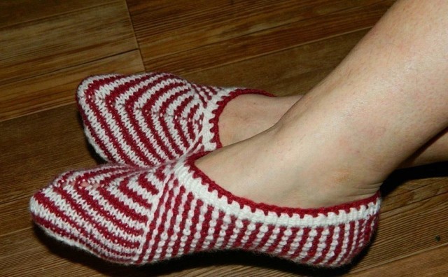 Тапочки Klubokhttp://klubok.work/1/53/7569/Klubokhttps://klubok.work/css/image/top-logo-en.pngТапочки спицами На 39 размер набрать 79 пет. и вязать полой резинкой 8- 10 рядов . Затем разделить вязание на 3 части: 39+1+39 пет. В каждом лицевом ряду вязать из одной средней петли 3 (лиц., нак., лиц.). Боковые части вязать рисунком 1 ряд (цв. А) - 1 лиц.,*1 сн.( нить за раб.), 1 лиц., повт. от * . 2 ряд (цв. А) - 1 лиц.,*1 сн.(нить перед раб.), 1 лиц., повт. от* 3 ряд ( цв. Б) - 2 лиц.,*1 сн.(нить за раб.),1 лиц., повт. от* 4 ряд (цв. Б) - 2 лиц.,*1 сн. (нить перед раб.),1 лиц.. повт. от* Повторять узор с 1 го по 4 ряд Так вязать до 9 тёмных полос и 8 светлых полос по передней части. Затем на средних центральных 13 пет. вязать подошву и задник следка по принципу вязания пятки носка. Хотите размер меньше , набирайте меньше петель