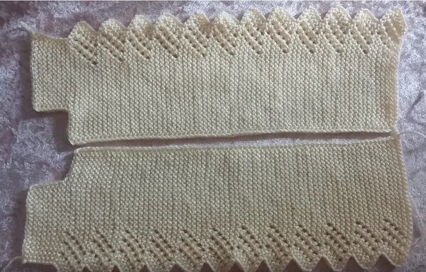 Для того чтобы такие следочки появились у Вас в коллекции нужно связать две простые одинаковые детали. Детальки связаны поперёк и должны быть в зеркальном отражении, поэтому лучше выбрать узор, который будет одинаково выглядеть с обеих сторон, чтобы особо не заморачиваться с зеркальным вязанием...