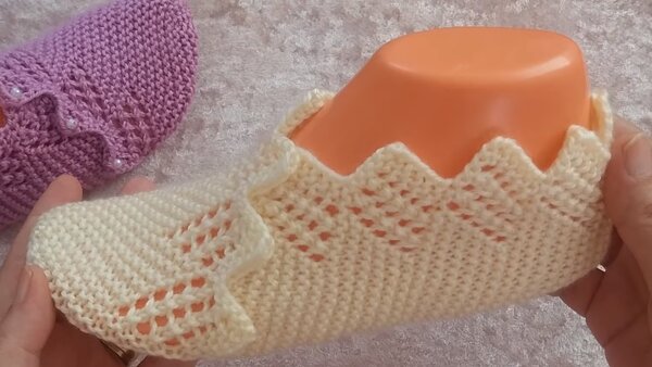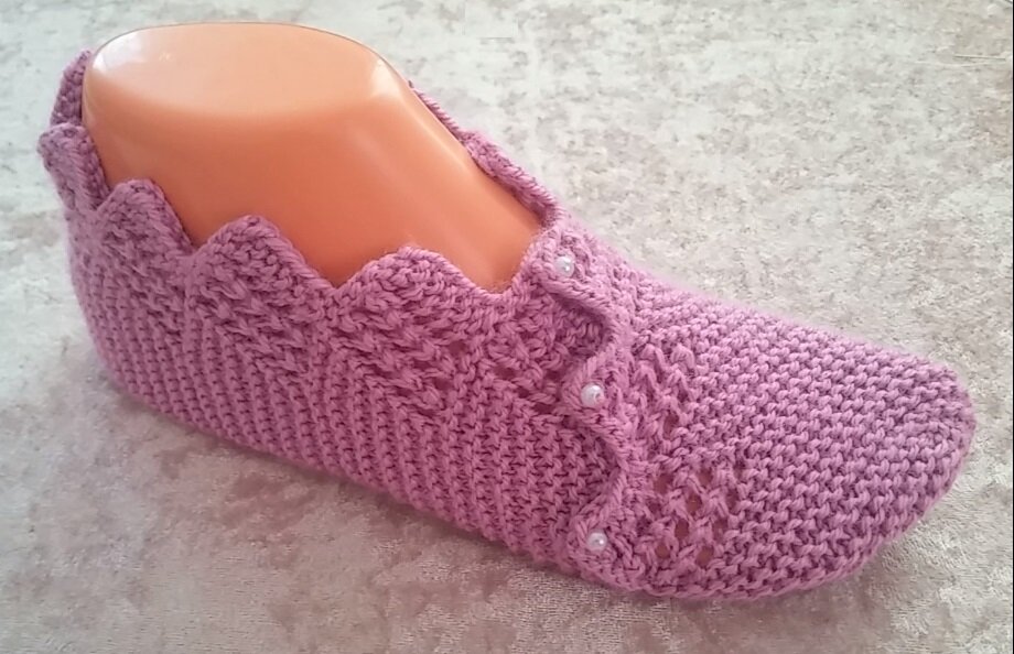 Длина детали - длина ноги умноженная на 2. Причём, не довязывая до конца детали сантиметра, я так думаю, 3-4 нужно закрыть треть петель, а на остальных вязать платочной вязкой, но без зубчиков, так, чтобы высота этого "отростка" была по размеру равна длине отрезка закрытых петель...