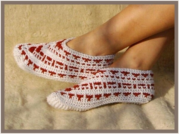 Тапочки спицами , описаниеKlubokhttp://klubok.work/1/53/7682/Klubokhttps://klubok.work/css/image/top-logo-en.pngТапочки вяжутся двумя нитями разных цветов. Сначала вяжем вход для ноги (он начинается на уровне щиколотки). Для этого набираем 49 петель. Вяжем несколько рядов лицевыми. Обычно так провязывают 3-5 рядов. Лицевые провязываются даже в изнаночных рядах. Получается, что полотно вяжем платочной вязкой. Далее формируем узор, вводим в вязание нить другого цвета. В 1-м ряду снимаем первую петлю, 1 лицевая, следующую снять, 5 вяжем лицевой. Таким образом вяжем лицевыми до 25 петли. Она получается средней. Из под этой петли провязываем ещё 9 петель, чередую лицевую, накид, лицевую. 1 .Следующую, 26 петлю, снимаем. 2 . 27 вяжем лицевой. Два последних действия повторяем до конца ряда, снимая и провязывая петли. Первый ряд закончили. Во втором ряду снимаем петли, провязанные первой нитью. Петли, провязанные другим цветом выполняем лицевыми. В 3 и 4 ряду опять берём первую нить и вяжем все ряды лицевыми. Повторяем первые 4 ряда 4 раза. В следующем этапе провязываем петли через одну (первую снимаем). Средняя петля -29. Формируем из неё 9 петель так же, как и в прошлый раз. В следующем изнаночном ряду снимаем петли через одну. Провязываем следующие 2 ряда той же нитью лицевыми. Далее необходимо сформировать подошву. Для этого приложите раппорт к ступне и посчитайте, сколько повторений узора будет равно длине ступни. Количество петель в подошве должно быть нечётным. Подошва формируется с помощью поворота. Высчитываем количество петель, которое должно быть в подошве. Вяжем предыдущий ряд лицевыми до этих петель. Потом переворачиваем вязание в др. сторону. Далее вяжем только эти петли. В конце ряда последнюю петлю подошвы и боковины провязываем вместе. Так вяжем до нужной длины. Пятка формируется тоже методом расчёта петель. Её оставляют напоследок. Петли пятки провязываются вместе с петлями подошвы. Удобнее провязывать петли пяток с боковушками крючком.