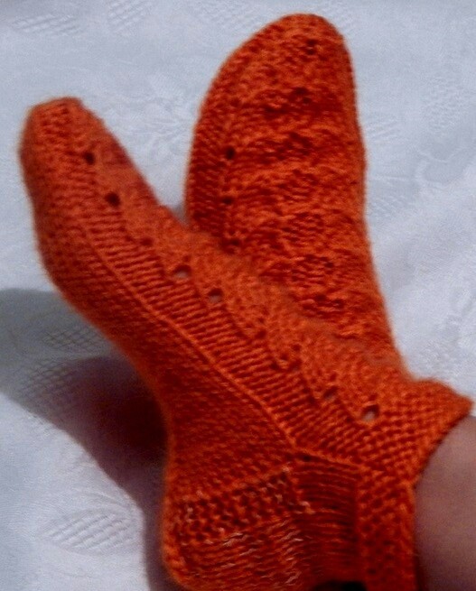 ВЯЗАЛА КАК ОБЫЧНЫЕ НОСКИ, ВМЕСТО РЕЗИНКИ 3 РЯДА ПЛАТОЧНОЙ ВЯЗКОЙ . Узор : 1р. - 2из., накид , 4 лиц., 2 вместе лиц. за заднюю стенку , 2 изн. , 2 вместе лиц. за переднюю стенку , 4 лиц. накид 2р. - 2 изн , 1 лиц. накид , 3 лиц. 2 вместе лиц. за зад. стенку 2 из. 2вместе лиц. за переднюю стенку 3 лиц. накид 1 лиц. 3р- 2 из, 2 лиц. накид , 2 лиц. , 2 ли. вместе за заднюю стенку 2 из. 2 вместе лиц. за перед. стенку , 2 лиц. , накид , 2 лиц. 4р - 2 из. 3 лиц. накид, 1лиц. 2 вместе лиц. за зад.стенку 2 из. 2 вместе лиц.за перед . стенку , 1 лиц. накид 3 лиц. 5р- 2 изн. 4 лиц. накид 2 вместе лиц. за задн.стенку 2 изн 2 вместе лиц. за перед.стенку накид 4 лиц. 6р-2 изн. 5 лиц 1 лиц снять перед работой(на зубочистку или спицу) 2 изн.снять и оставить за работой (на другую зубочистку или дополн. спицу) 1лиц. затем провязать 2 изн. которые сняты за работой, затем 1 лиц ,которая снята перед работой , 5 лиц. Затем повтор с 1-го ряда ...