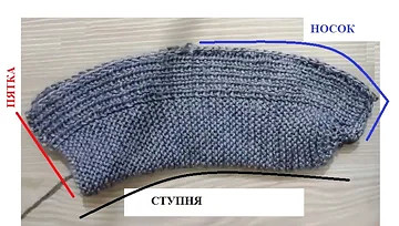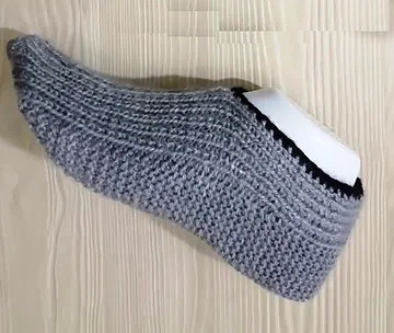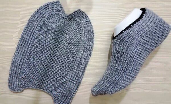 Вяжем таким образом прямоугольник на высоту равную длине нашей стопы минус 2 см. Далее, три ряда с убавками. Причём, отрезки с резинкой (первые и последние 12 петель полотна) не трогаем, убавляем лишь петли платочной вязки. Выглядеть это будет следующим образом: 1 ряд – 12 петель резинки (включая кромочную, *провязать 2 петли вместе лицевой*- 13 раз, 12 петель резинки 2 ряд – 12 петель резинки, *провязать 2 петли вместе лицевой*- 6 раз, 1 лицевая, 12 петель резинки 3 ряд - 12 петель резинки, провязать 2 петли вместе лицевой, 3 петли вместе, 2 петли вместе, 12 петель резинки. В следующем ряду все петли закрываем. Складываем деталь пополам и сшиваем края… примеряя тапочки по ножке.