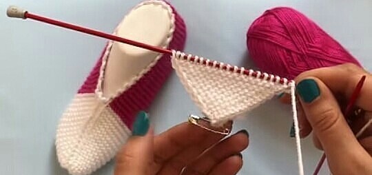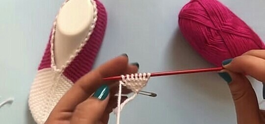 Нить обрезаем , присоединяем 1-й цвет . Дальше будем сокращать , чтобы вывязать второй угол тапочка 1 ряд : кр , все изн , кр 2 ряд :кр , все изн , кр 3 ряд : кр , 2 вместе , все изн , 2 вместе , кр 4 ряд : кр , все изн , кр 5 ряд кр , все изн , кр 6 ряд : кр , все изн , кр 7 ряд : кр , 2 вместе , все изн , 2 вместе , кр 8 ряд : кр , все изн , кр Повторяем 7 и 8 ряды , пока не останется 3 петли . Закрываем петли .