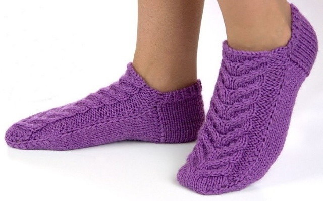 Следки на двух спицах для начинающих можно сделать интереснее, если использовать ажурные, жаккардовые или рельефные рисунки. Очень красиво смотрятся следки с разными формами «плетения» косы или несколькими косичками и жгутиками, сплетенными в один узор. В описании ниже представлен один из вариантов оформления верхней части следка с узором «Колос» Для работы следует приготовить: 250 г любой пряжи (желательно не очень тонкой); 2 прямые спицы без стопперов, размер №3; булавку-маркер; линейку, ножницы. Последовательность вязания следков с узором : Набрать на спицы 24 петли и провязать резинкой 1х1 6 вертикальных рядов (1,5 см). Связать пятку высотой 6,0 см – 21 ряд лицевой гладью. С 22 ряда нужно начать оформление чашечки пятки. Для этого нужно поделить полотно на 3 равные части (получается по 8 петель). Далее вязать так: 8 изн. п. (бок), 7 изн. п. (центр), 8 петлю боковой части провязать вместе с петлей боковой части 1 изнаночной петлей. Вязание перевернуть. 1 кромочную петлю снять не провязывая, 6 лиц. п. (центр), 8 петлю центральной части провязать с петлей боковой части 1 лиц. п. (наклон влево). Вязание перевернуть. Схема вязания узора «Колос» :