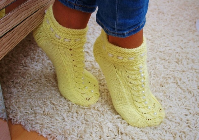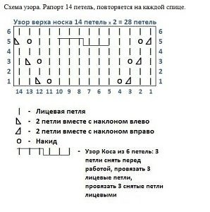 НосочкиKlubokhttp://klubok.work/1/53/7842/Klubokhttps://klubok.work/css/image/top-logo-en.pngЭто описание коротких носков. Как получить более длинные варианты, рассказано в конце статьи. Прежде всего, необходимо набрать 56 петель и распределить их между четырьмя спицами (по 14). Далее соединяем их в круг. При этом важно следить, чтобы они не перекрутились. Верхняя часть носка вяжется резинкой 1 на 1 10 рядов. После этого описание рекомендует перейти к выполнению пятки. Она выполняется по определенной схеме из петель, содержащихся на двух спицах лицевой гладью (в нечетных рядах – лицевые, в четных – изнаночные). Так как пятка вяжется не по кругу, не стоит забывать о кромочных. Через 20 рядов полотно пятки носка требуется разделить на 3 части: 9 + 10 + 9. Можно пометить границы каждого участка носка специальными колечками. Теперь начинается частичное вязание по следующему описанию: выполнить все петельки крайней части носка; вяжем 9 центральных петель; последнее звено центра связать вместе с первым с крайней спицы; работу развернуть и повторить с первого пункта. В частичном вязании все петельки носка выполняются по рисунку. Вязание пятки продолжается в соответствии с описанной схемой, пока от вязания не останется только 10 петелек. Переход к вязанию стопы Для продолжения работы над носком необходимо связать ряд и набрать из закрытого края сбоку пятки 11 петелек. После этого провязываются по 14 петель с двух отложенных спиц. Теперь вновь набираются 11 петелек с противоположной стороны. Провязав 5 петель, получаем, следующее количество звеньев в работе: на первой и четвертой спице по 16; на второй и третьей – по 14. Дальше носочки вяжутся по кругу, при этом следует сравнять количество петель на всех спицах по следующей схеме: на первой провязать 14 петелек, а 15-ю и 16-ю объединить; вторую и третью спицы вязать без изменений; на четвертой в начале ряда связать две вместе, закончить вязание круга; через ряд убавления повторить, выполнив вместе две последних петли на первой и две первых на последней; после этого на всех спицах получится равное количество петель – по 14. Начало ажура Теперь можно начинать выполнение ажура. Вязать его нужно по расположенной ниже схеме. На ней есть описание всех обозначений. Чтобы при объединении петелек получить наклон влево, нужно первую из них снять, вторую провязать и накинуть непровязанную на нее. Для наклона вправо достаточно просто провязать петельки вместе. В этой модели ажурной является только верхняя часть носка, противоположная пятке. То есть, если пятку вяжем на первой и последней спицах, ажурный рисунок следует вывязывать на второй и третьей в соответствии со схемой. Раппорт предложенного узора составляет 14 петель. Поэтому после окончания провязывания ажурного рисунка на первой спице следует начинать схему сначала на второй. Выполняя ажурные носки спицами в соответствии с предложенным описанием, низ рекомендуется вязать только лицевыми. Окончание работы Когда полотно, начиная от пятки, достигнет примерно 14 см, можно начинать выполнять мысок. При этом важно придерживаться нескольких правил: мысок, который завершит ажурные носки, будет выполнен лицевой гладью, поэтому следует завершить раппорт по схеме (то есть количество рядов должно быть кратно шести); описание соответствует 37 размеру. Основываясь на плотности вязания, а также размере ноги, сл